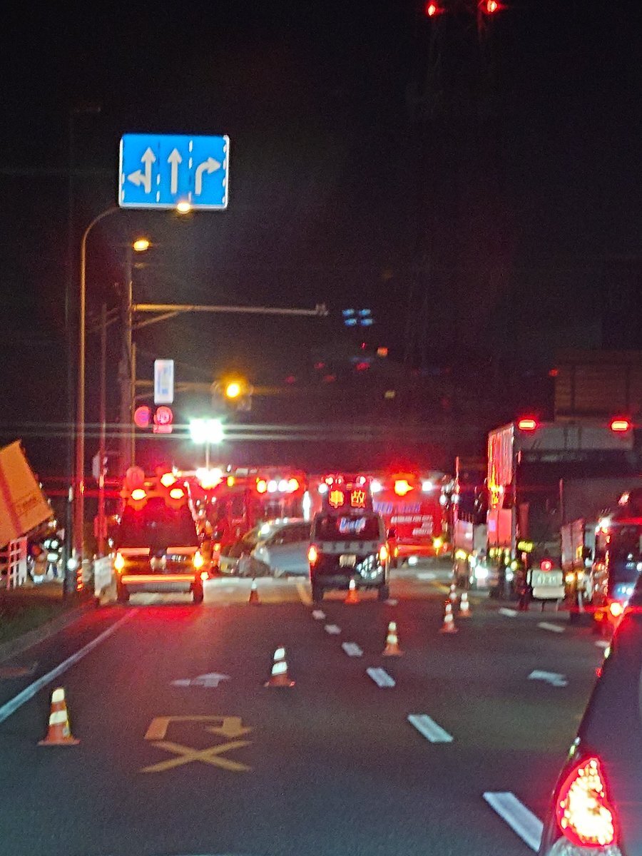 『部イオンモール前辺りの交差点でトラックがなんか、すげぇ事故を起こして、渋滞始まってますからね〜 消防車が道を止める形で停車して迂回を促してましたよー』