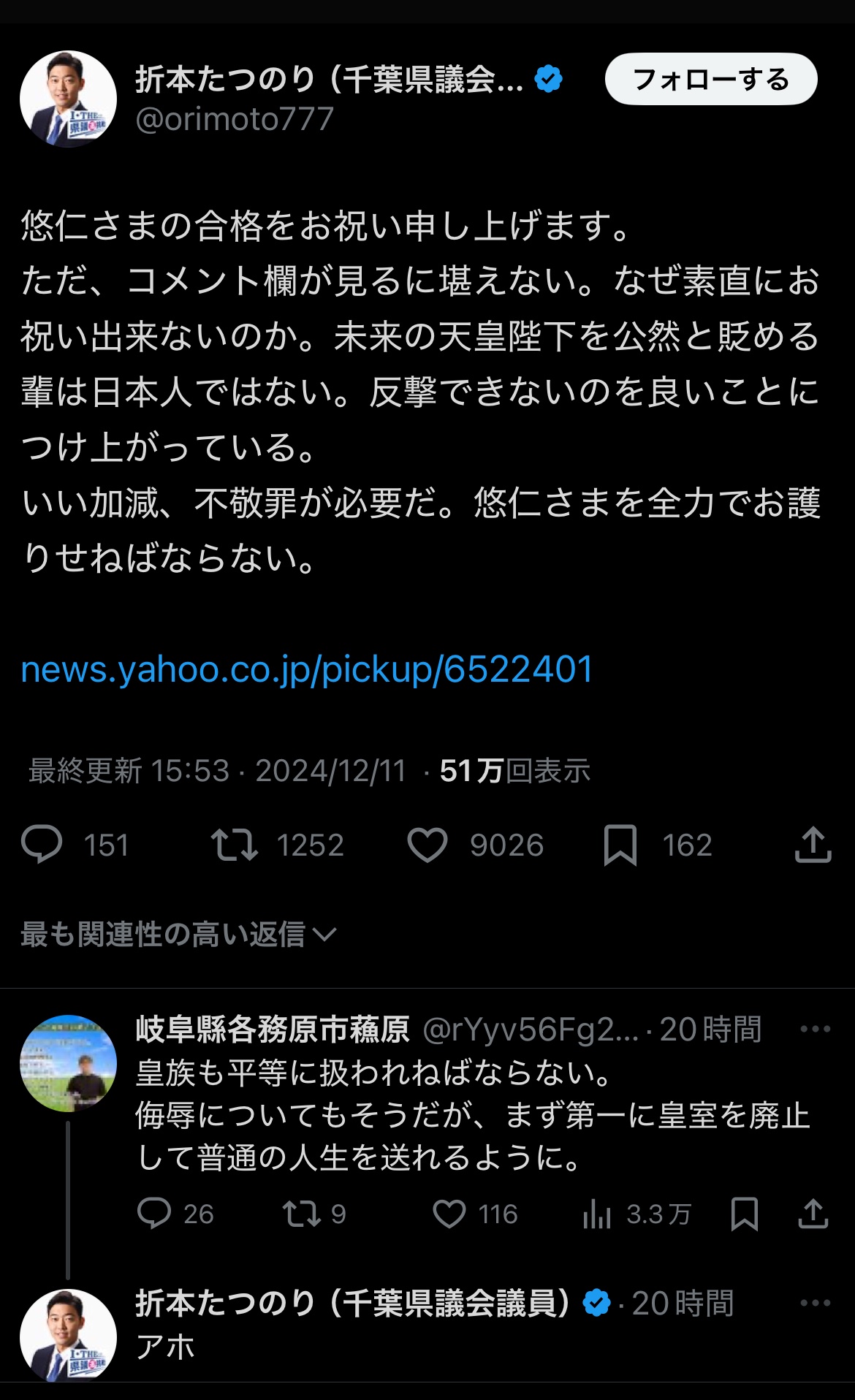 千葉県議「悠仁さまの筑波大学合格を祝えない人間は不敬罪で逮捕せよ」→こうなる 2024/12/13 速報 お、おぅ https://x.com/orimoto777/status/1866738116784202092?s=46 document.write(” + ”); 関連記事 document.write(” + ”); 続きを読む ——— Source: アルファルファモザイク 千葉県議「悠仁さまの筑波大学合格を祝えない人間は不敬罪で逮捕せよ」→こうなる