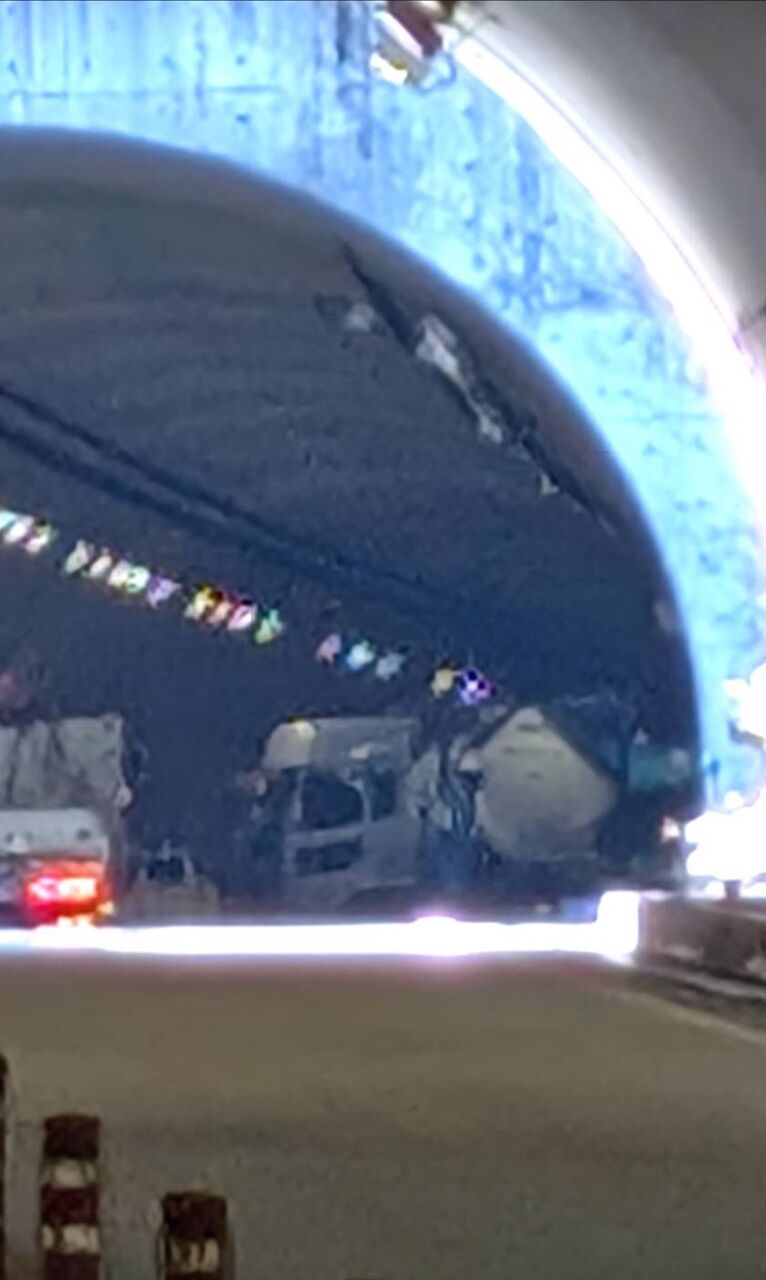 東九州自動車道、北川IC付近のトンネル内事故発生直後の写真を提供頂きました。トンネルが大型の車両によって塞がれている状態です。