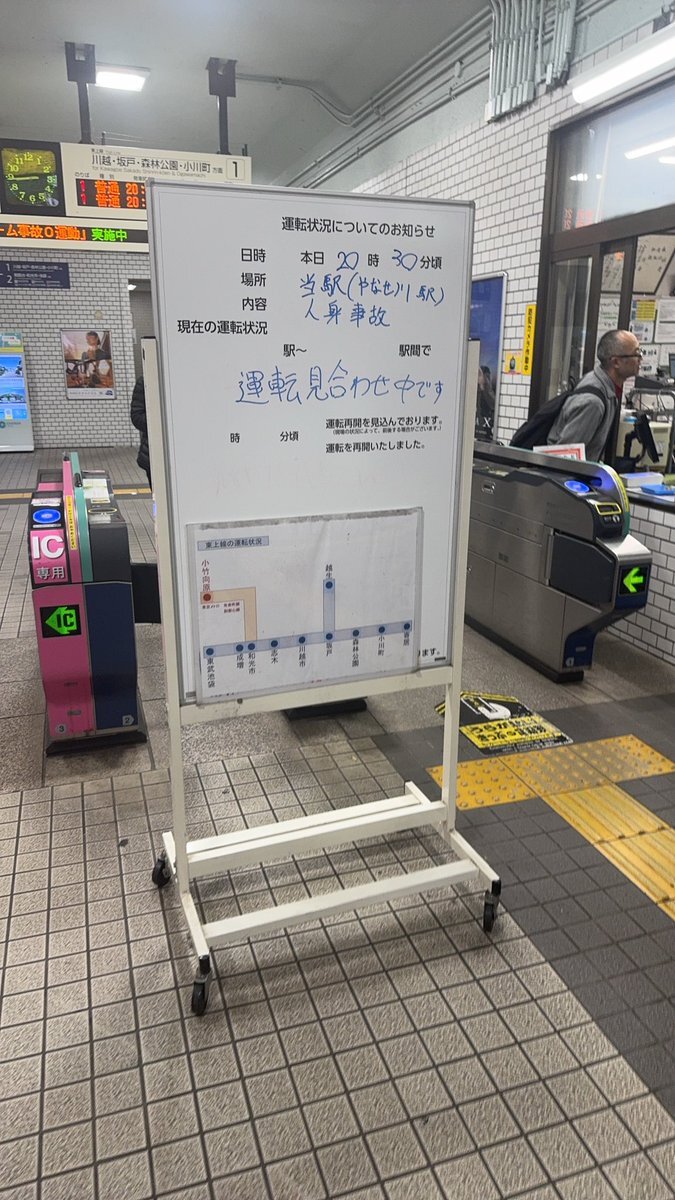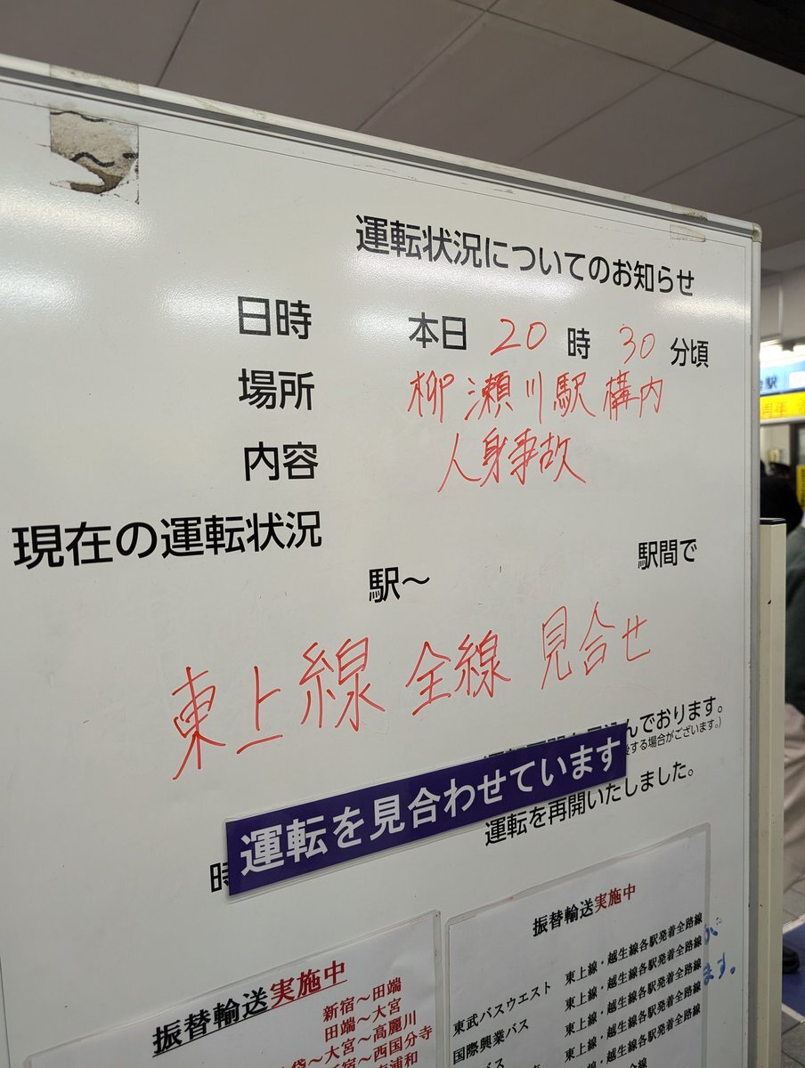 2024年12月17日 21時11分02秒 【東上本線】 20時27分頃、柳瀬川駅で発生した人身事故の影響により、成増〜川越市駅間の上下線で運転を見合わせています。