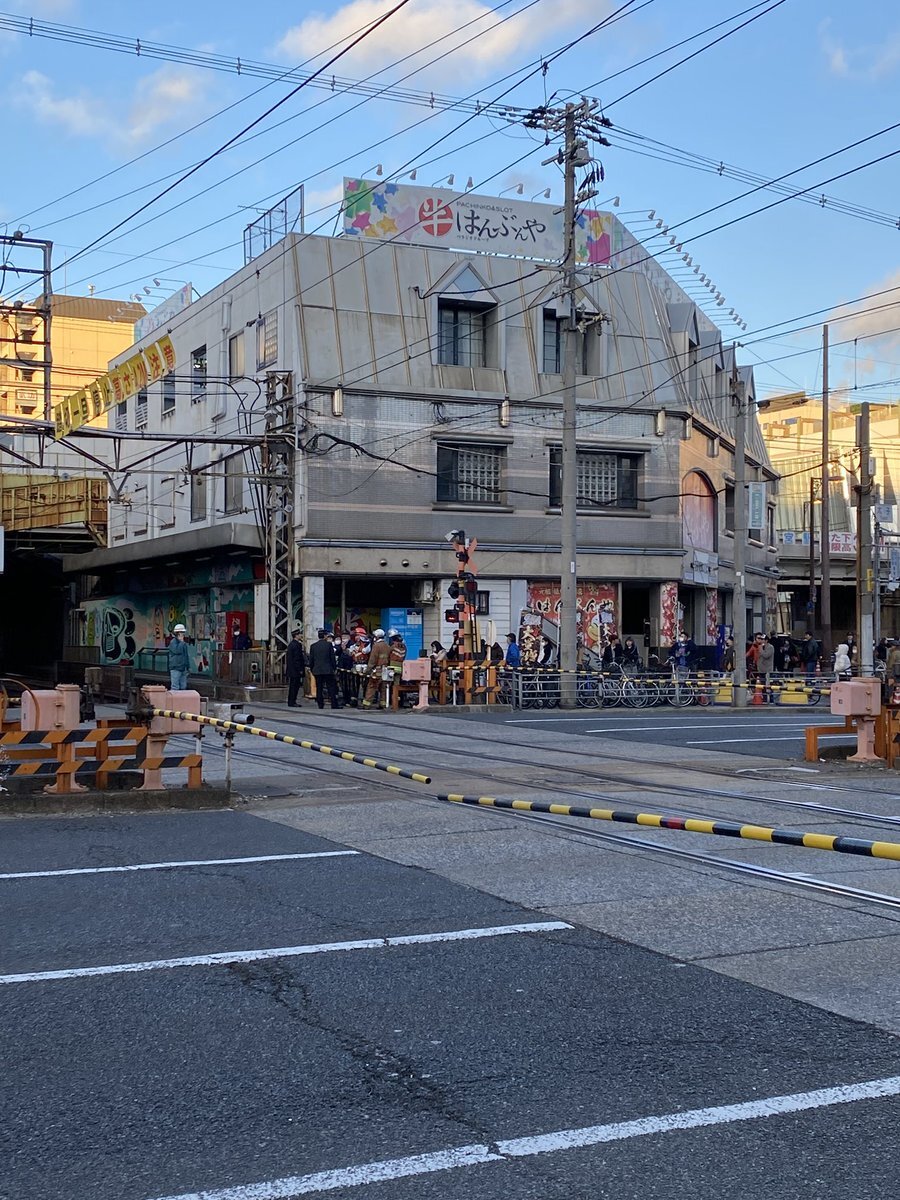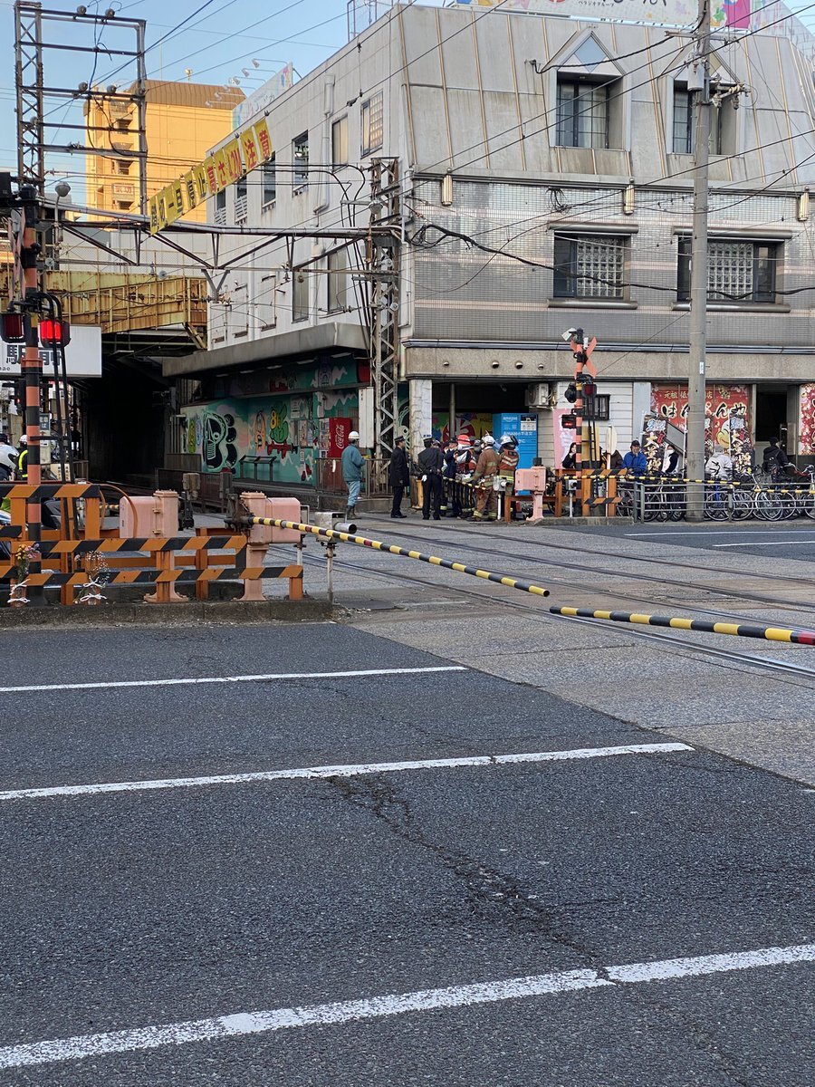 『踏切降りたままで近づいたら阪堺の架線なんか垂れ下がって通行止めなってる 』