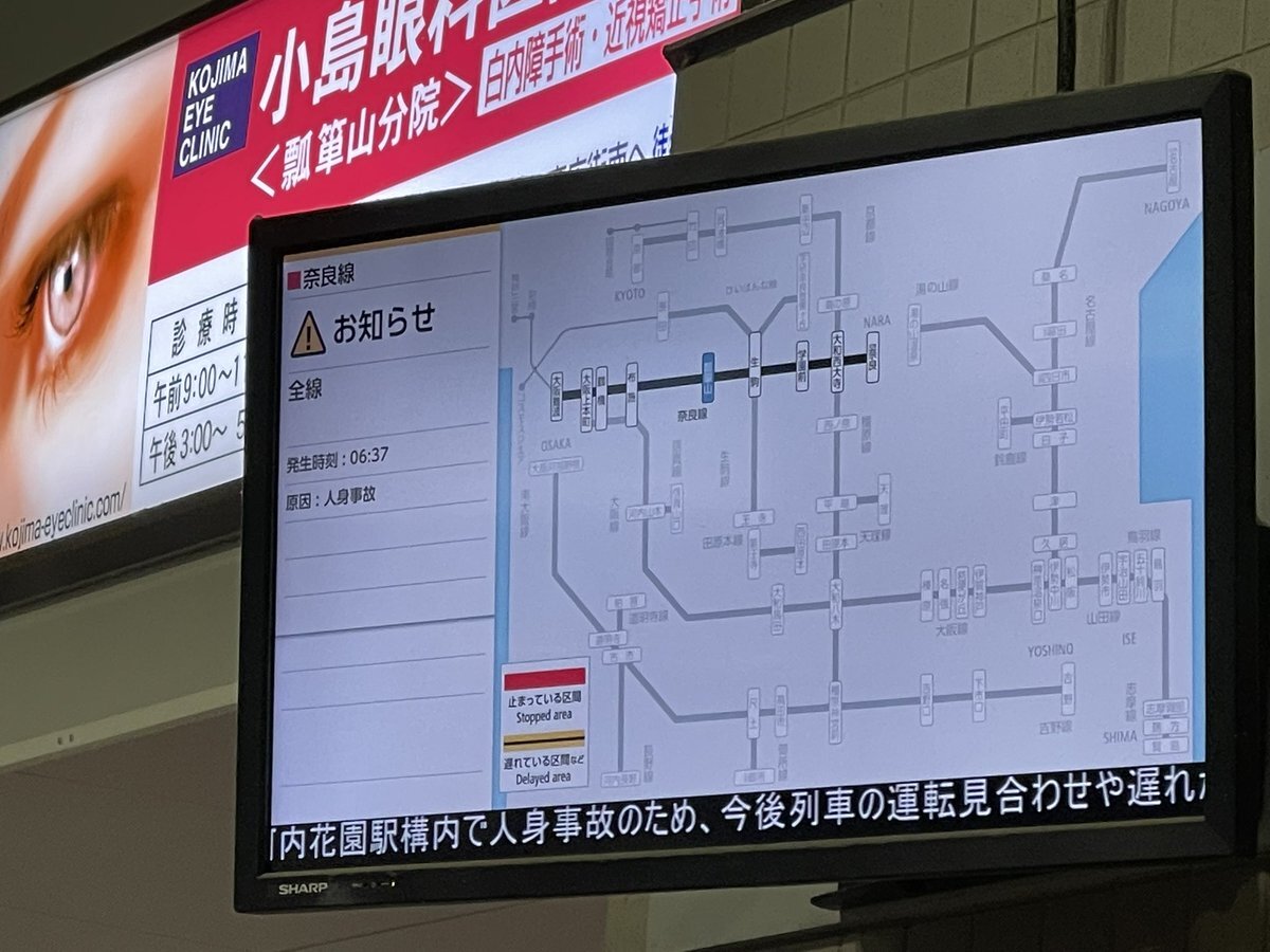 【阪神なんば線】06:37頃、近鉄奈良線内で発生した人身事故の影響で、一部列車に遅れや運転変更が出とってぴえん🥺 pic.twitter.com/2BAh22TEk3