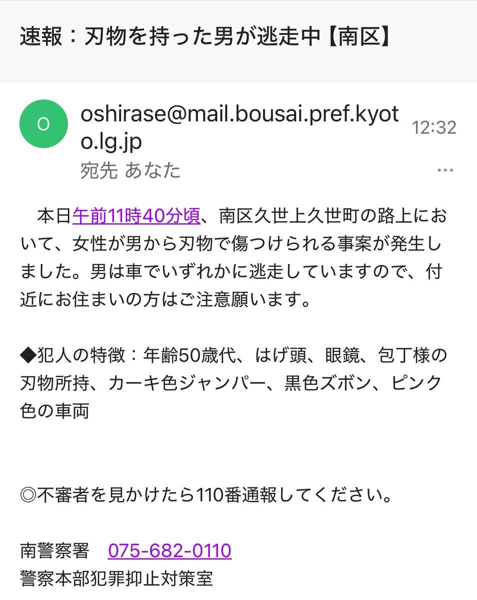 【速報】京都市南区で「40代の女性が何者かに刃物で刺された」と通報 男は刃物を持って逃走か(読売テレビ)#Yahooニュースhttps://t.co/ndt3fggiYM— YUKI (@y_kossn) December 23, 2024