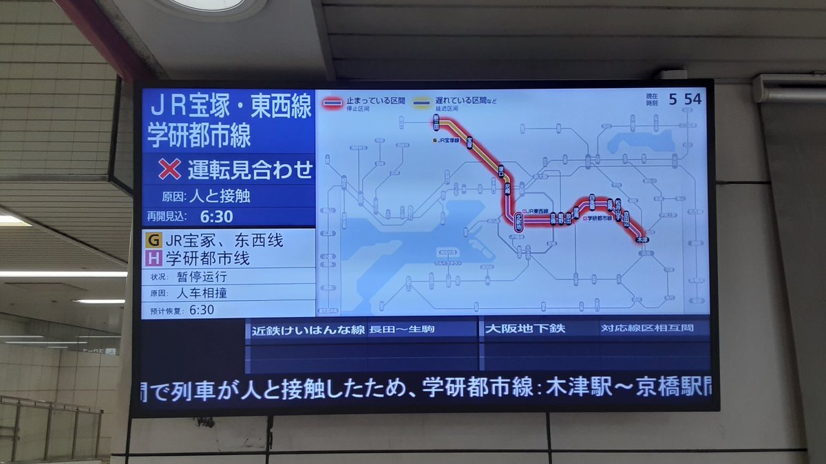12月24日8時22分現在: 学研都市線:鴫野駅〜京橋駅間で列車が人と接触したため、JR神戸線・学研都市線・JR東西線・JR宝塚線・おおさか東線の列車に遅れや運転取り止めがでています。このため、振替輸送を実施しています。 #JR西日本 https://t.co/YFMMghHIKM pic.twitter.com/X9KySAZLGD