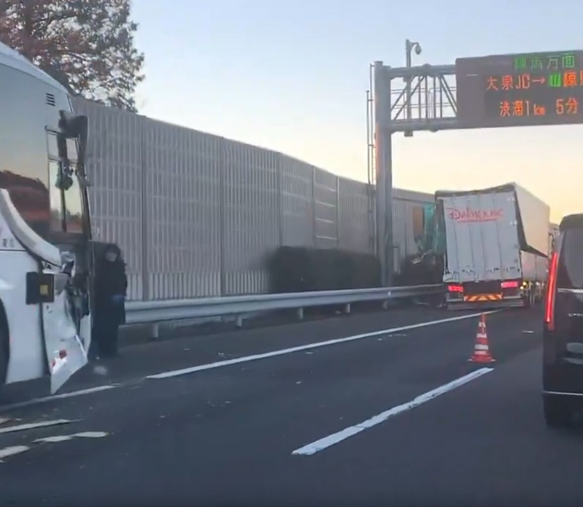 圏央道内回り、大型トラックに大型バスが追突とか珍しいな