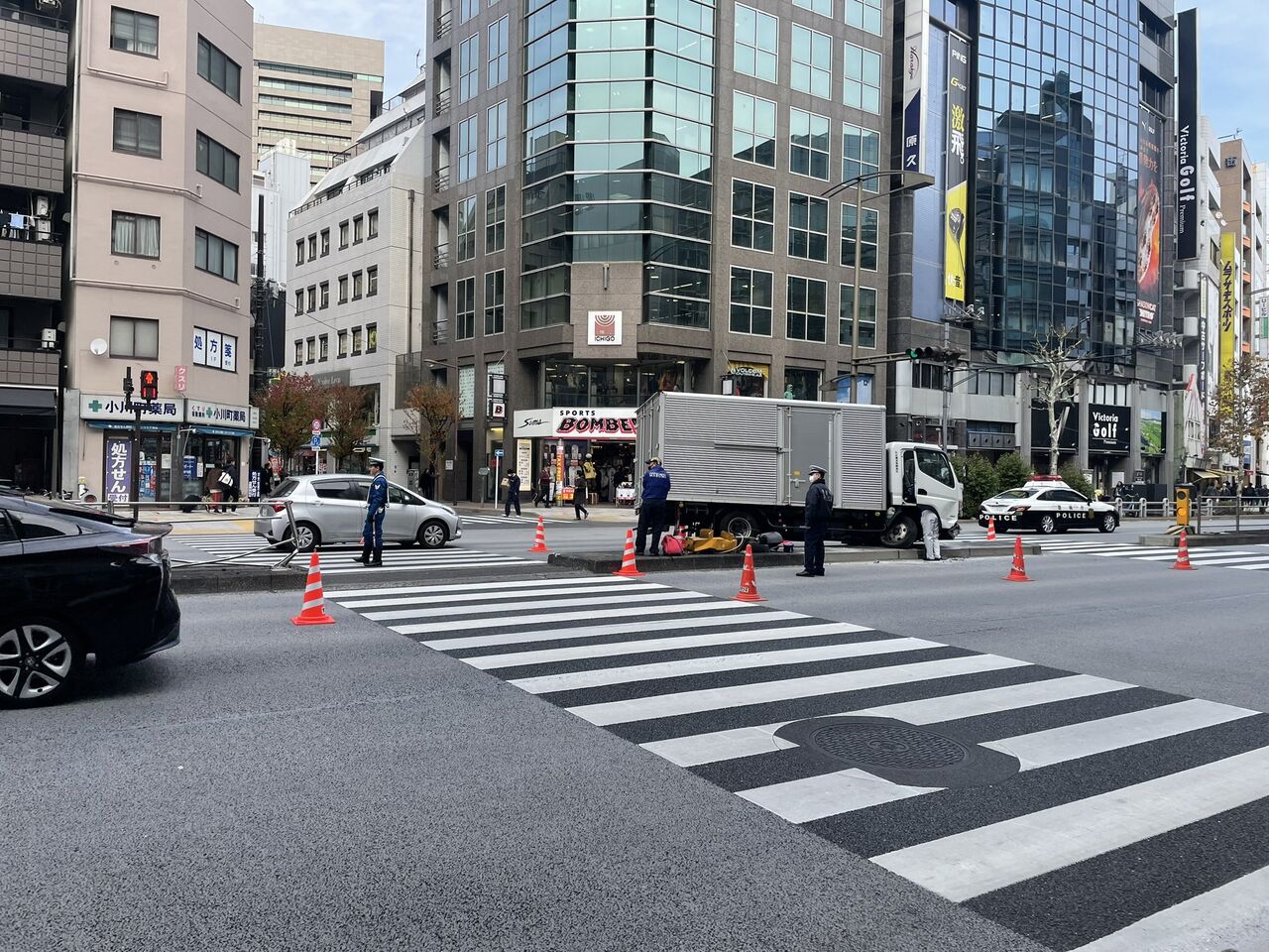 『靖国通り神田小川町近辺、トラックのタイヤひん曲がってる事故』