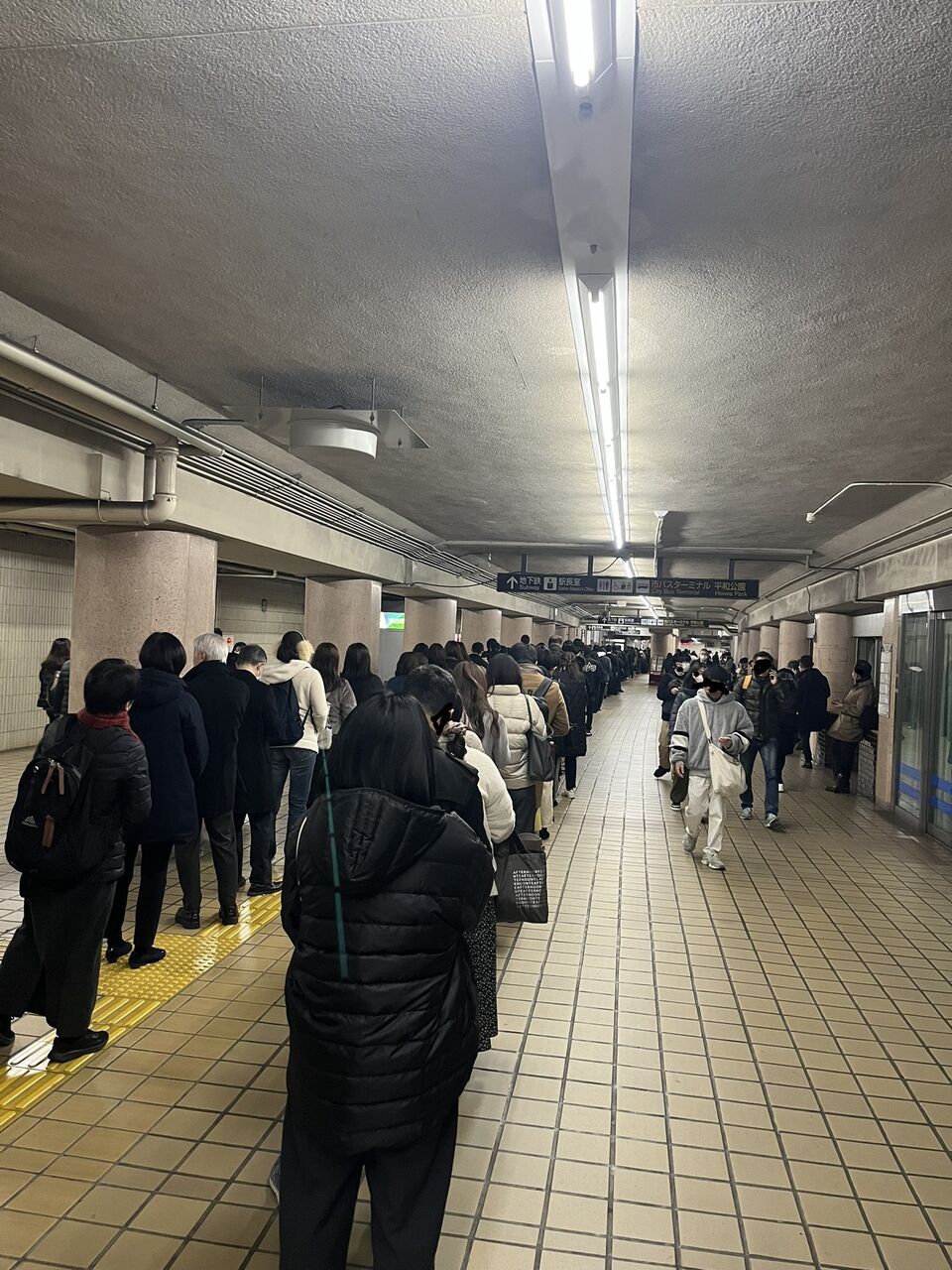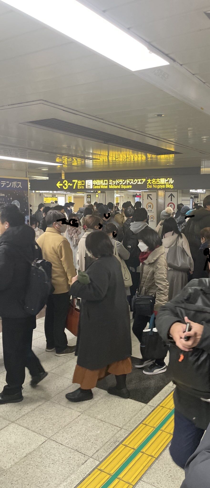 【現場の状況】『栄駅当該ホーム一部封鎖、出勤ラッシュ重なり混雑』#名古屋市営地下鉄 #東山線 栄駅で人身事故により運転見合わせ遅延12月26日 #名古屋 #地下鉄 #年末 #年の瀬