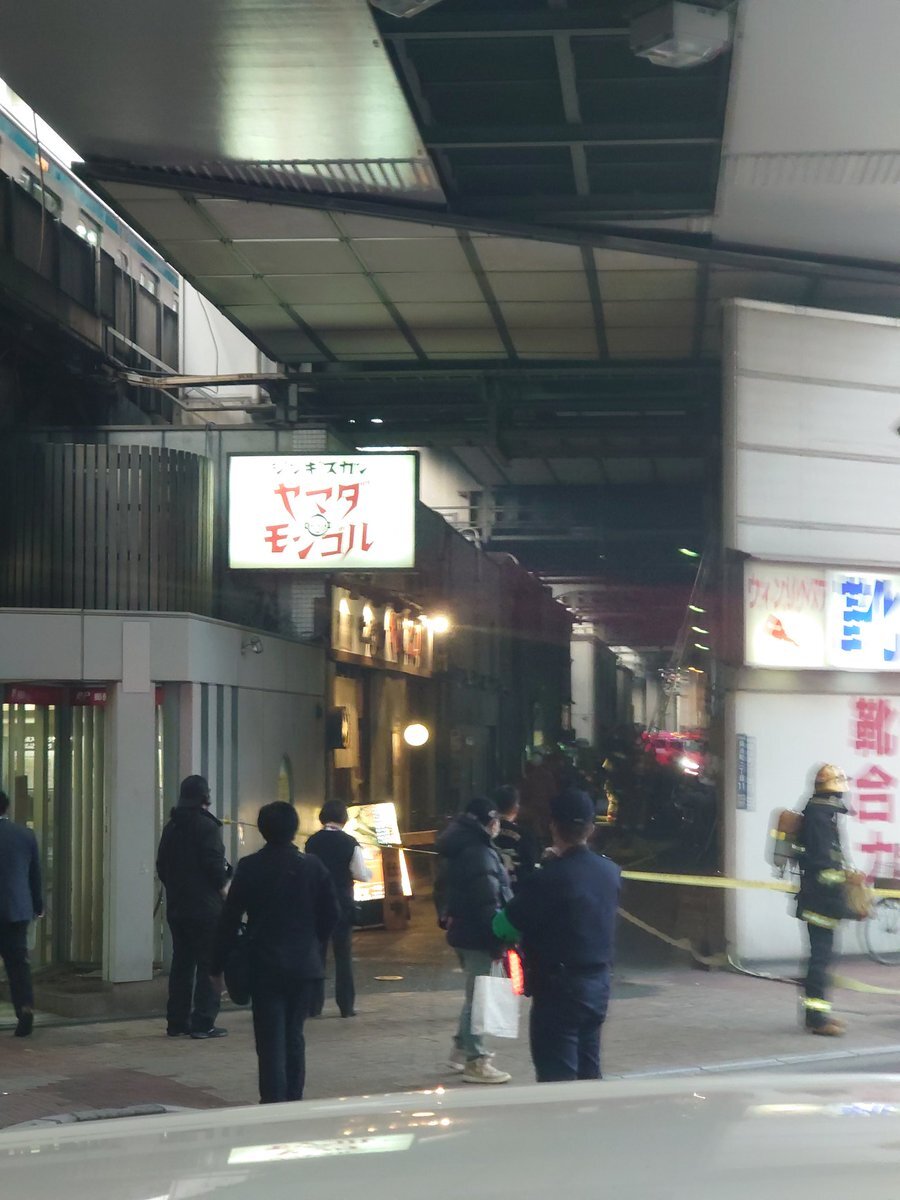 『神田駅の北口の高架下の店が燃えたのか?規制線が張られ、消防車が10台以上いた』