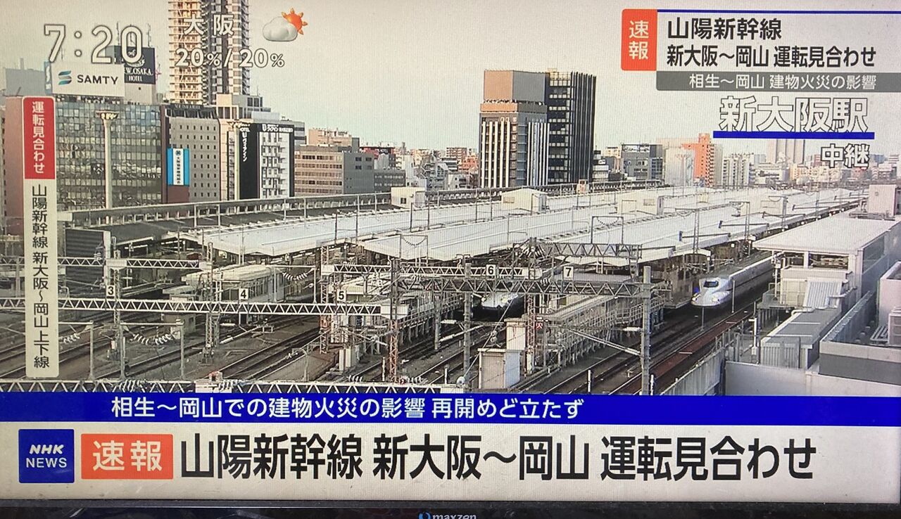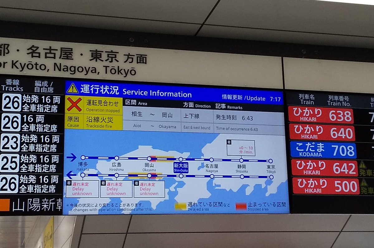 相生-岡山間で火災発生したらしく新幹線遅れが出るかもって💦