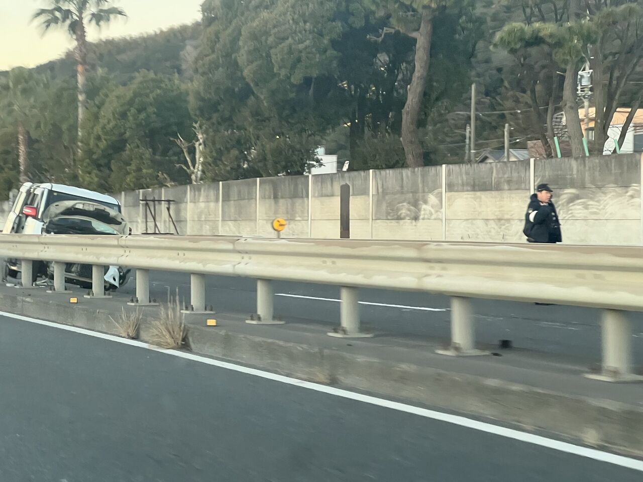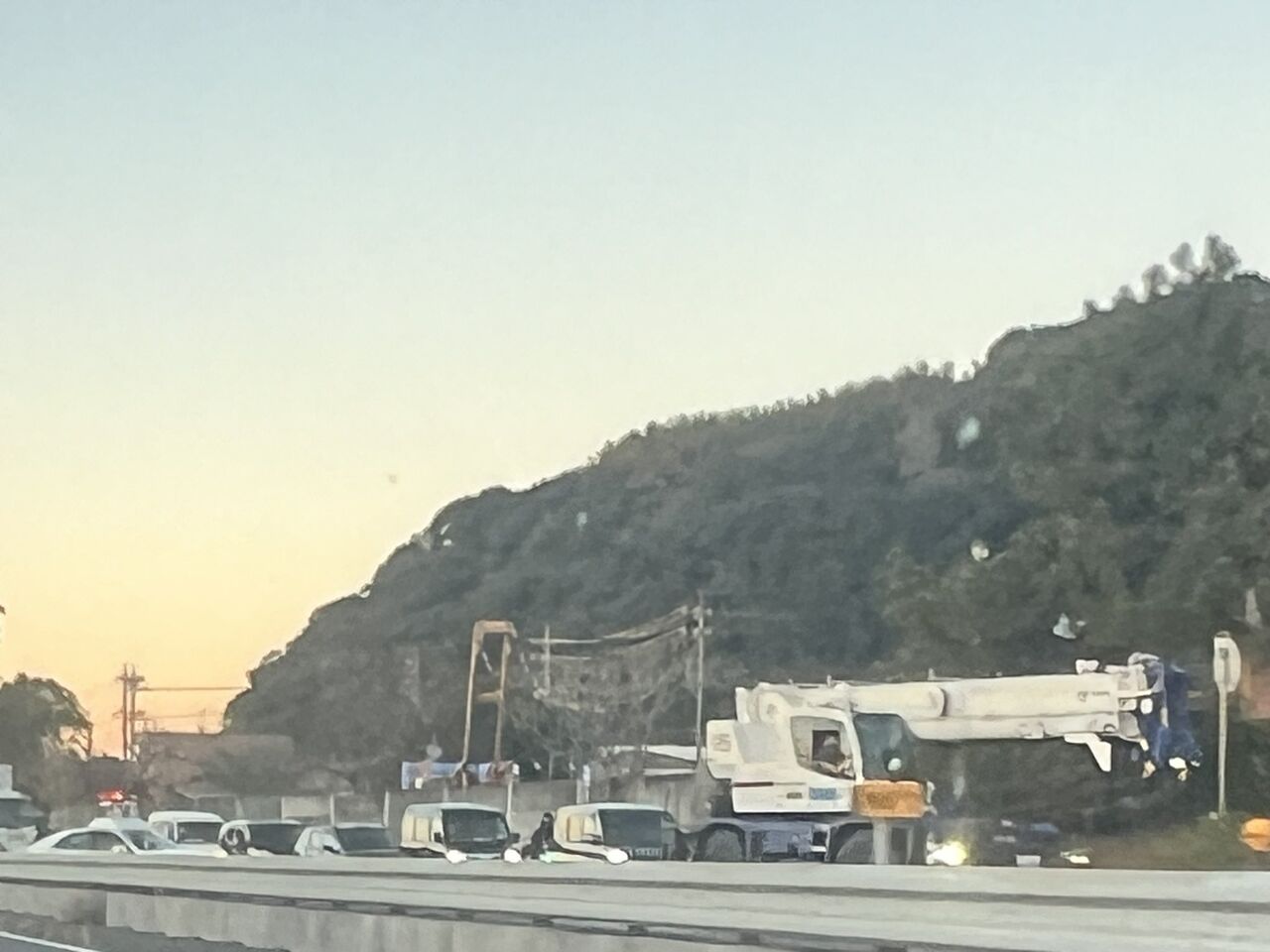 『国道1号バイパス興津付近で数台絡むでかい事故のため、東京方面上りが手前で下ろされて旧道迂回させられてます。』