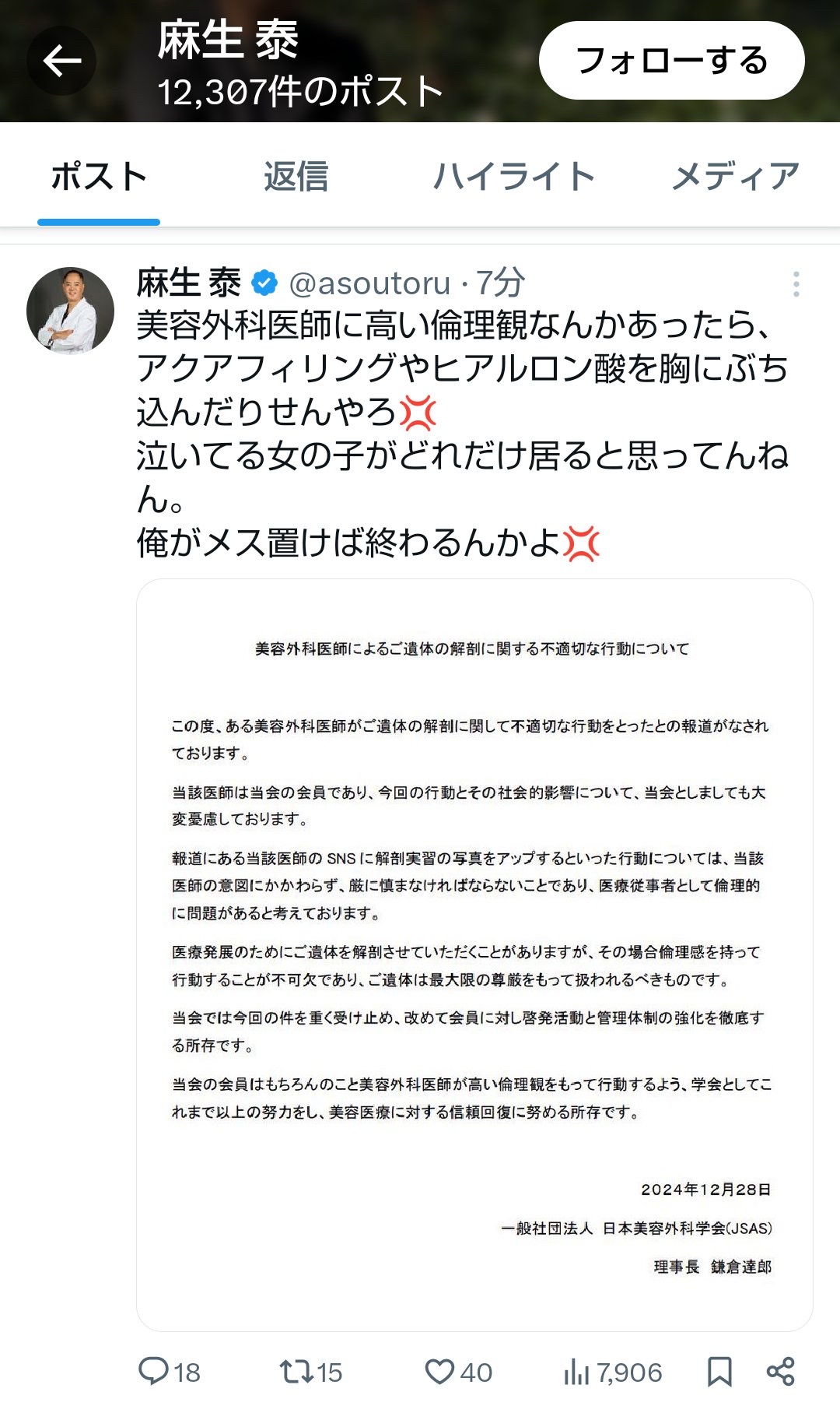 【緊急】麻生泰、致命的発言で美容整形業界を殺しにかかるwwww 2024/12/30 速報 麻生泰、高須院長に黒田あいみを押し付けるも断られXで大暴れ ↓ 麻生泰「倫理観あったら豊胸手術なんてできるわけないやろ💢」 ↓ 流石にマズいと思ったのか、このツイートだけコッソリ削除 — (@asoutoru) document.write(” + ”); 関連記事 document.write(” + ”); 続きを読む ——— Source: アルファルファモザイク 【緊急】麻生泰、致命的発言で美容整形業界を殺しにかかるwwww
