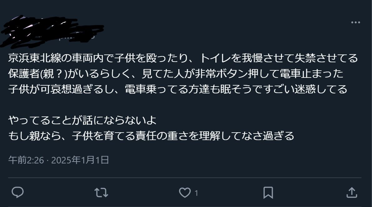 新年早々毒親?のせいで京浜東北線止められた………通報ブザー押した人が同じ車両いて会話してるの聞いたら隣の車両で子供殴ってるとの話っぽい、自分の子供だろがガチに舐めんなクソ親が………眠いからはよ帰りたいんだよクソ親が…………