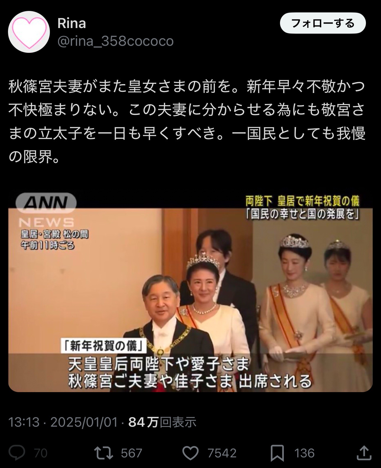 【地獄】秋篠宮夫妻、爆発大炎上 2025/1/2 速報 X民「イヤアアアアアアアア!!秋篠宮が皇女さまの前を歩いてるのおおおおおおお!!」 なにがいかんのや?🤔 ちなみに直前の行動がこれ — (@43H4LLg65tQNyEo) document.write(” + ”); 関連記事 document.write(” + ”); 続きを読む ——— Source: アルファルファモザイク 【地獄】秋篠宮夫妻、爆発大炎上