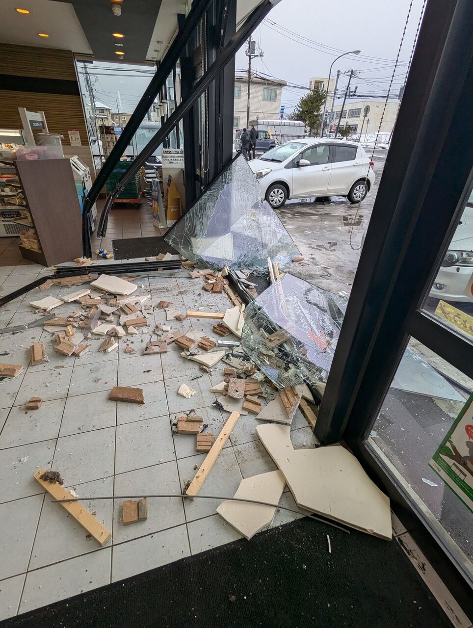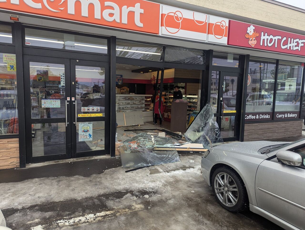 【現場の様子】#交通情報 北海道北斗市中野通2丁目 #道南いさりび鉄道 清川口駅北側付近 #セイコーマート 北斗中野通店に乗用車突っ込む事故1月6日 #北斗市 #函館 #仕事始め