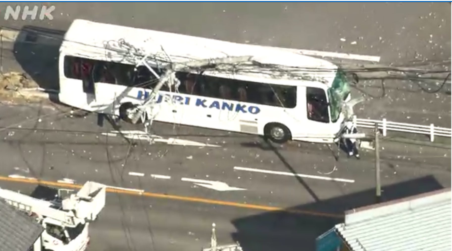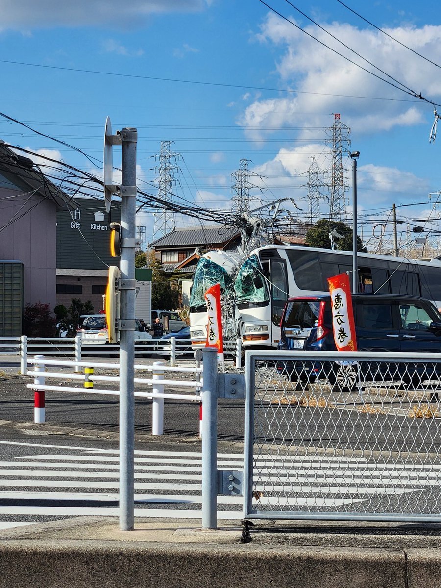 【目撃証言】#交通情報 県道467号 愛知県半田市岩滑西町ファミマ付近 30人くらい乗車の観光バスが電柱に衝突事故 周辺道路規制渋滞 乗客3人搬送怪我1月8日 #愛知県 #半田 #バス