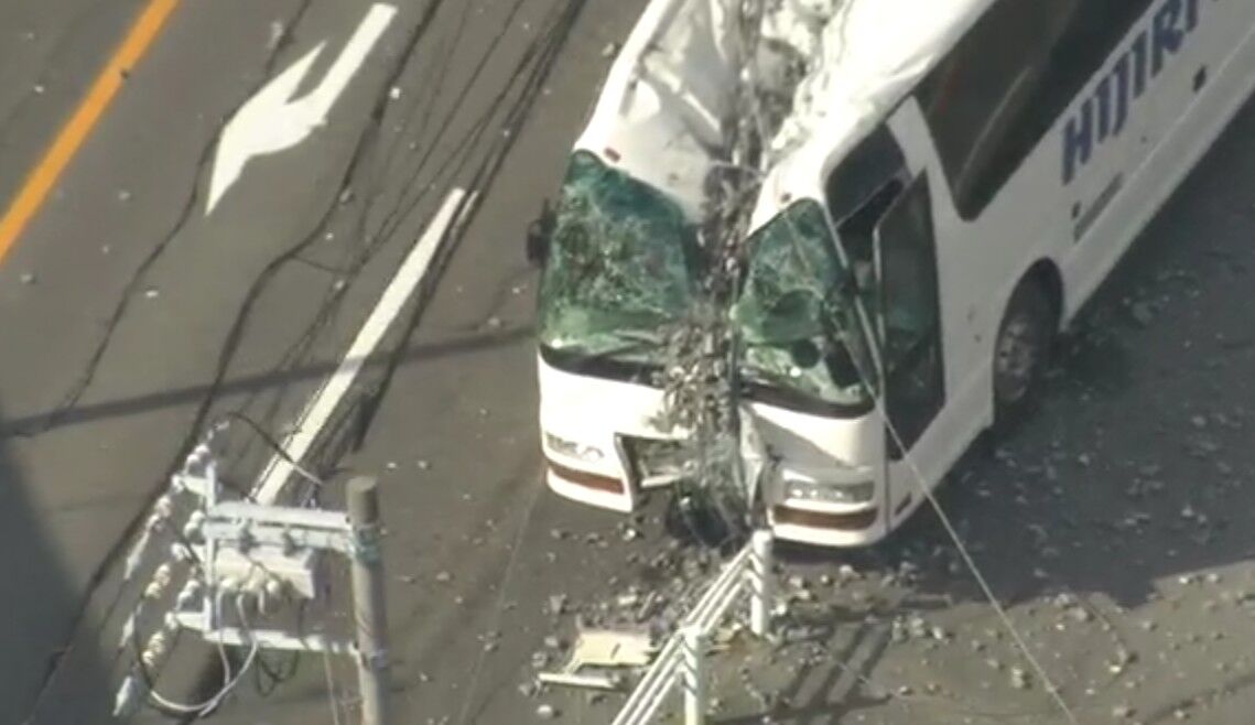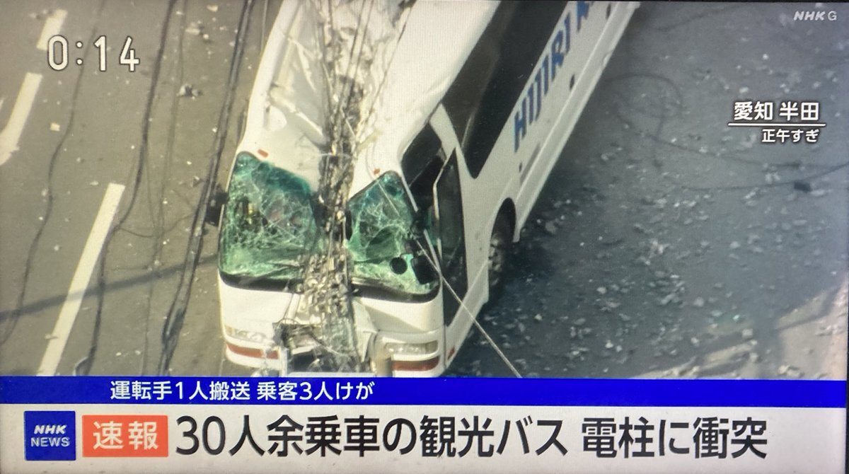 8日午前11時すぎ、愛知県半田市で、観光バスが道路脇の電柱に衝突する事故がありました。消防によりますと、バスには乗客と運転手、あわせて30人余りが乗車していて、運転手1人が病院に搬送されたということです。また、乗客3人が搬送されなかったもののけがをしているということです。警察や消防が詳しい状況を調べています。