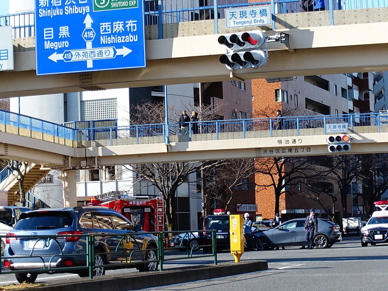 【現場の様子】#交通情報 明治通り 東京都渋谷区広尾5丁目天現寺橋交差点の中央でタクシーと乗用車衝突事故 外苑西通りなど規制渋滞1月9日 #港区 #渋谷 #恵比寿 #広尾 #西麻布 #白金