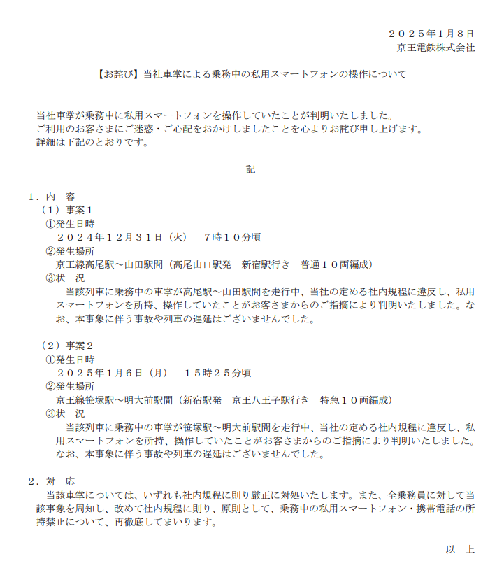 【お詫び】当社車掌による乗務中の私用スマートフォンの操作についてhttps://t.co/ojYAoWOkyz