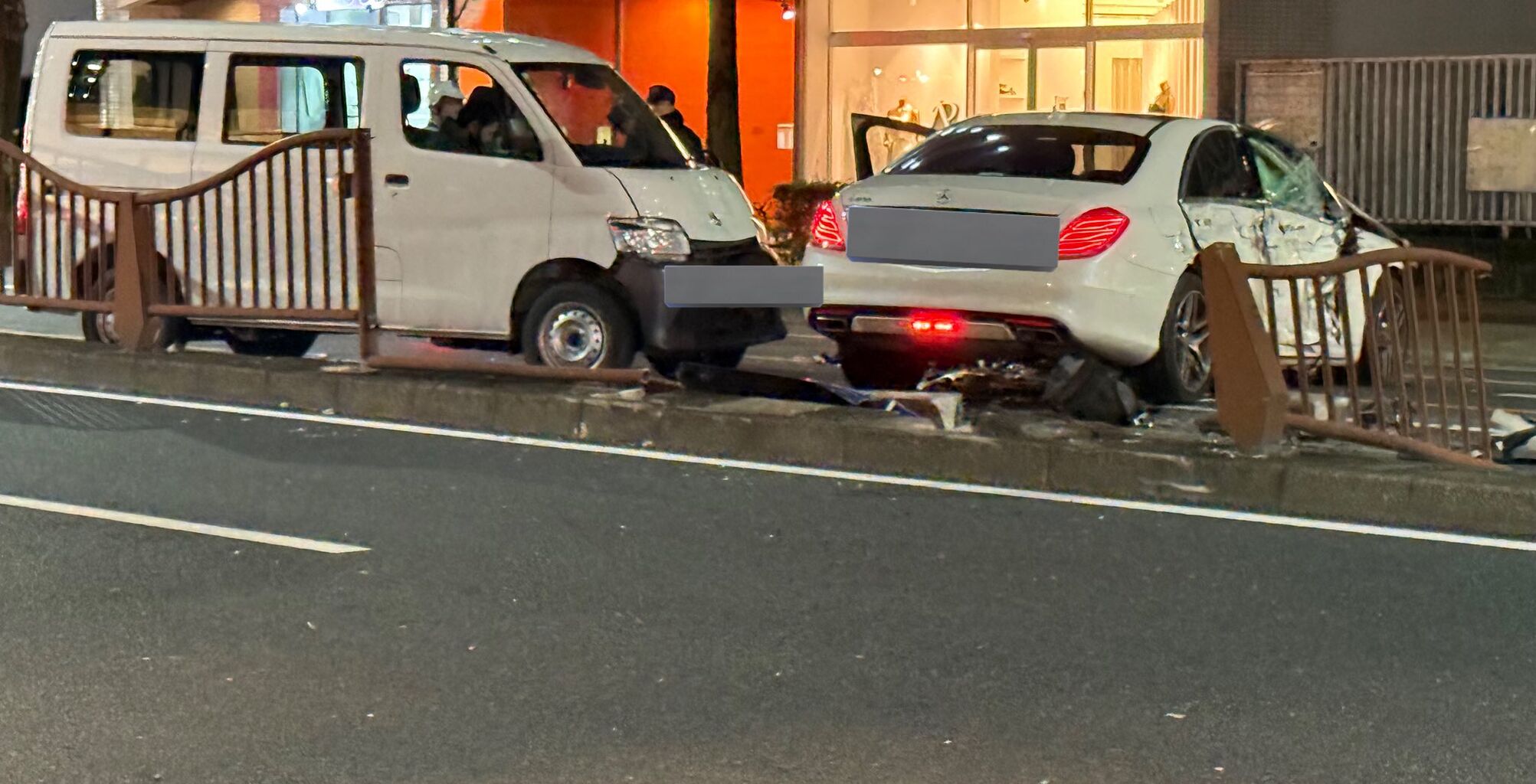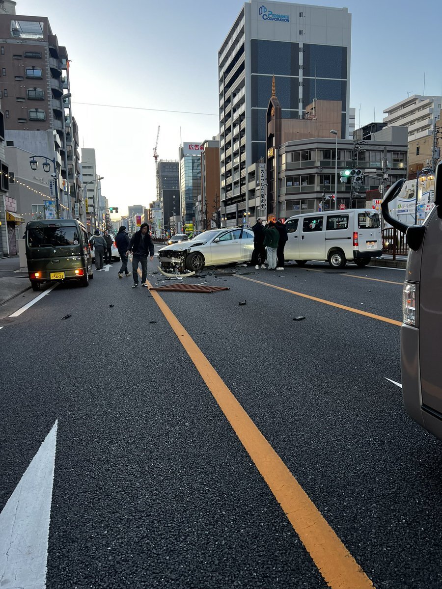 池下で事故してる😨ベンツ中央分離帯破壊して反対車線に😱