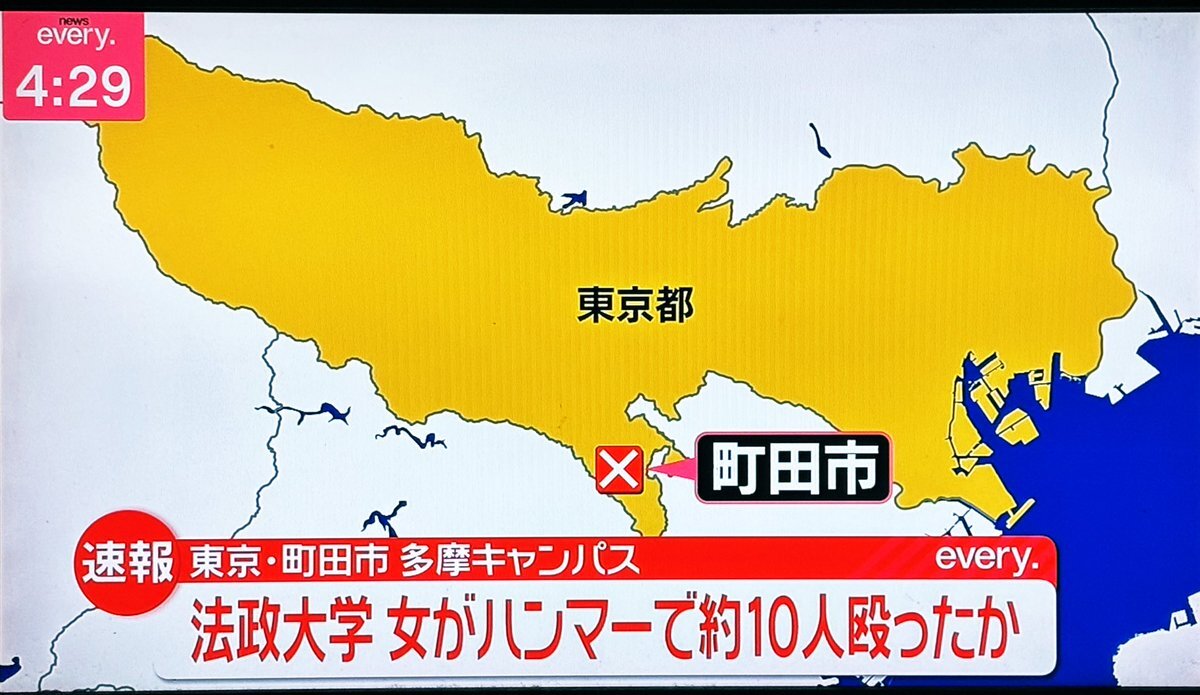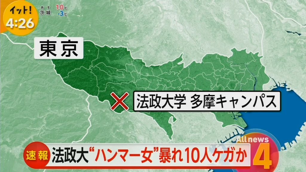 10日午後4時ごろ町田市相原町にある法政大学多摩キャンパスで、女がハンマーのような物を持って暴れているとの通報がありました。