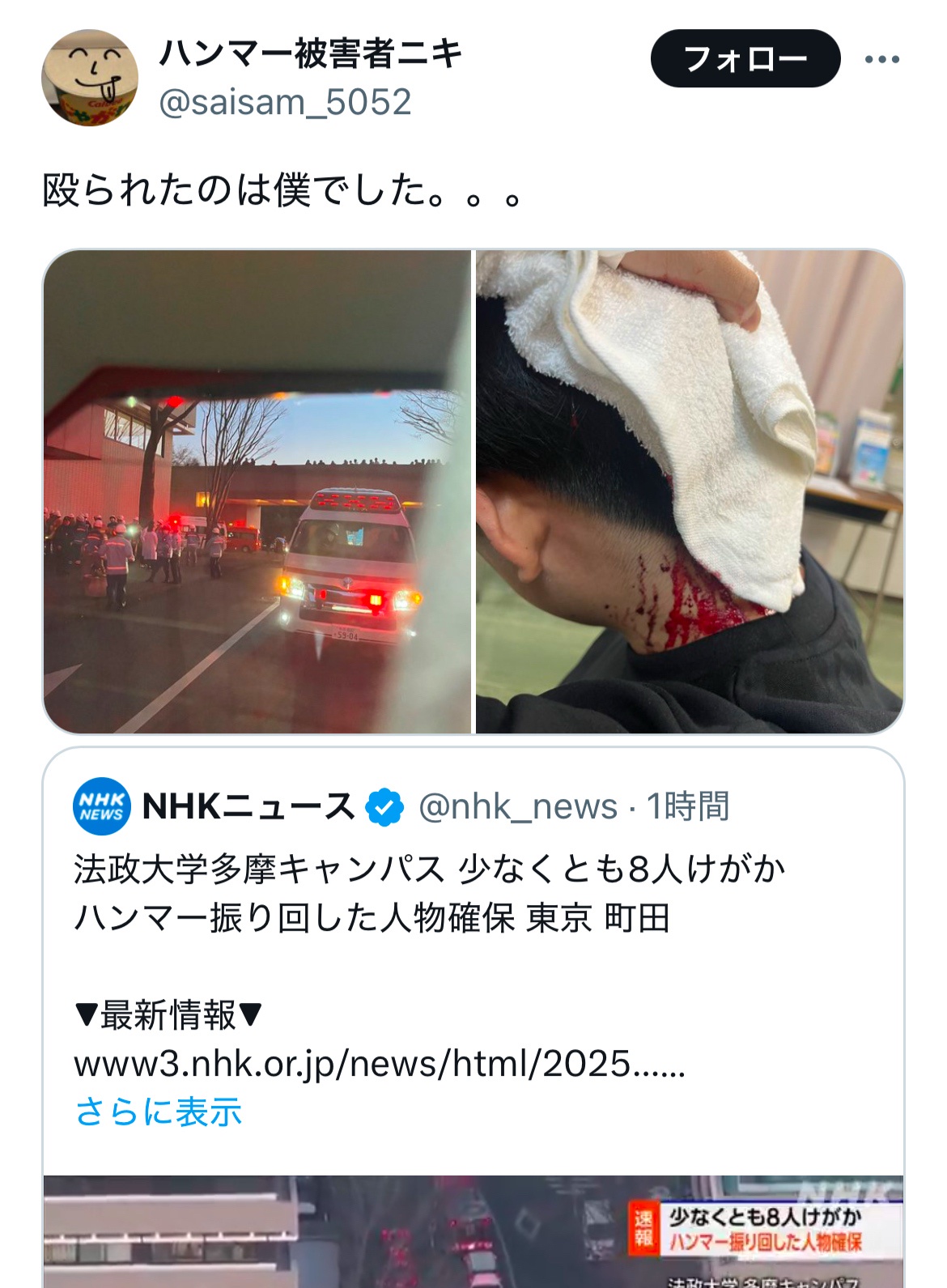 【決定的証拠】ハンマー女の異常性が一目で分かる画像がこれ 2025/1/10 速報 被害者、いきなり頭を狙われ殺されかけていた 殺意が有ったのは明白 https://livedoor.blogimg.jp/amosaic/imgs/4/9/4961eaba.jpg — (@saisam_5052) document.write(” + ”); 関連記事 document.write(” + ”); 続きを読む ——— Source: アルファルファモザイク 【決定的証拠】ハンマー女の異常性が一目で分かる画像がこれ