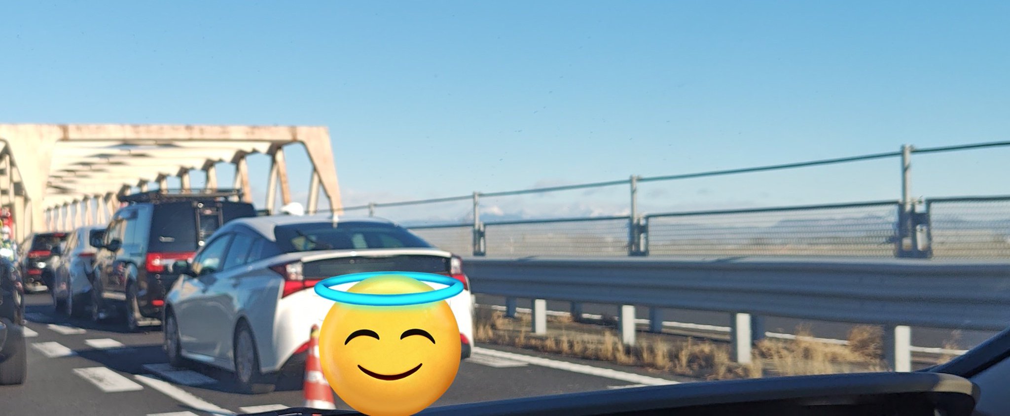 『東北道下り、羽生パーキングの先、利根川の橋の手前、4台のオカマ事故。そのすぐ後ろで、2台のオカマ事故してたぁ😞』