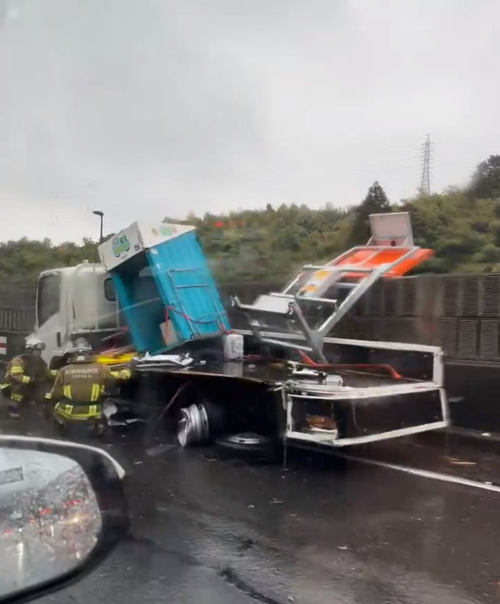 トラックのドアか天井の一部が防音壁から対向車線にはみ出してた』