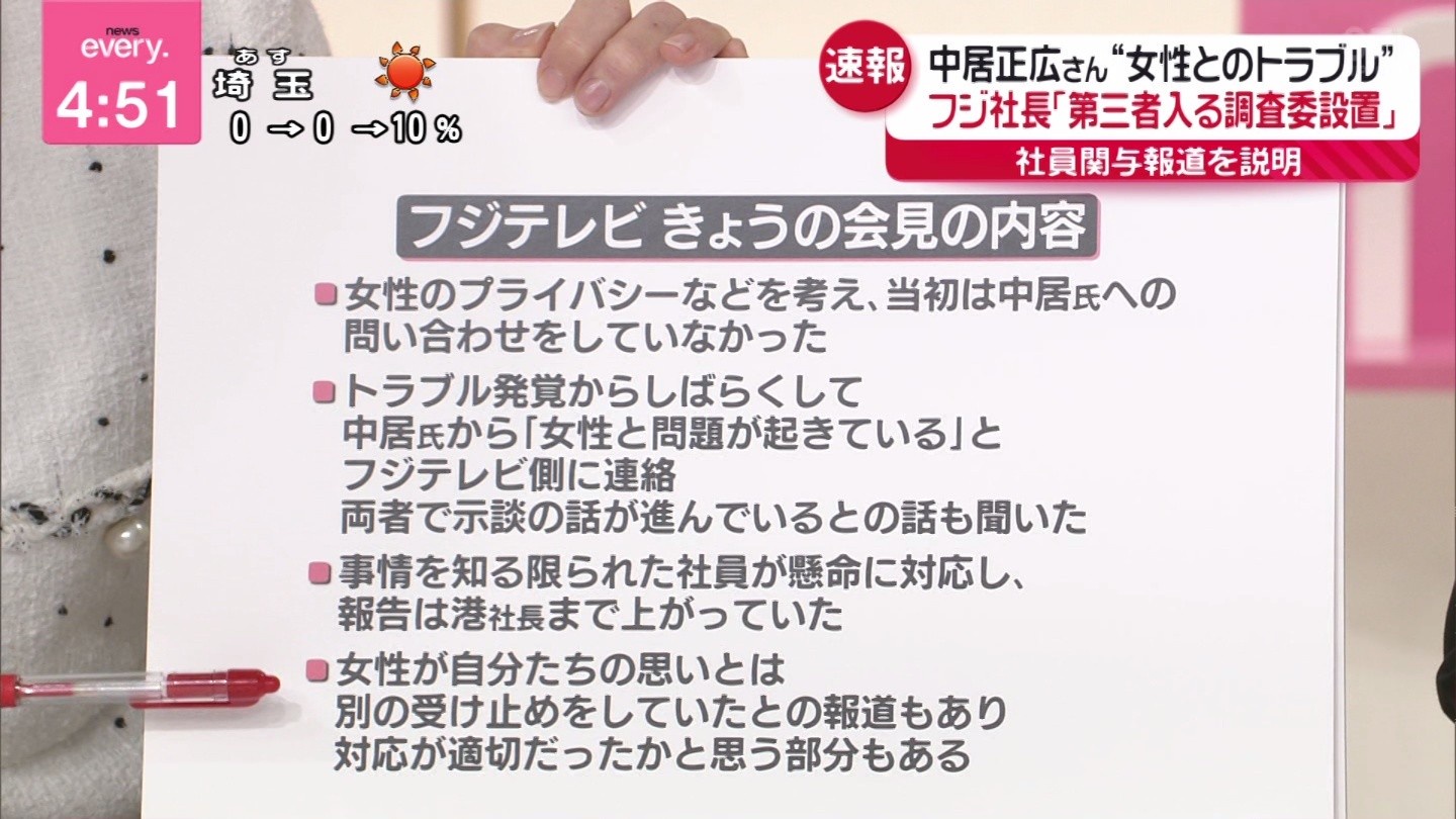 フジテレビ社長が会見 中居正広さんめぐるトラブルに「(当初から)報告は上がってきていた」「他者に知られずに仕事に復帰したい、という女性の意思を尊重した」