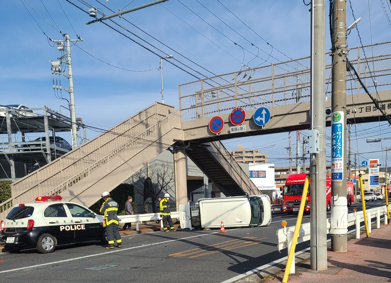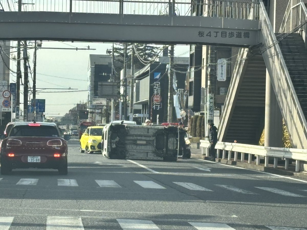 朝から横転事故です。栃木信用金庫 桜通り支店の目の前でやってます。9時頃発生でレスキュー臨場……。おそらく11時過ぎまでは……。皆さんもご安全に!#事故 #宇都宮 pic.twitter.com/w2VY8rAsmz