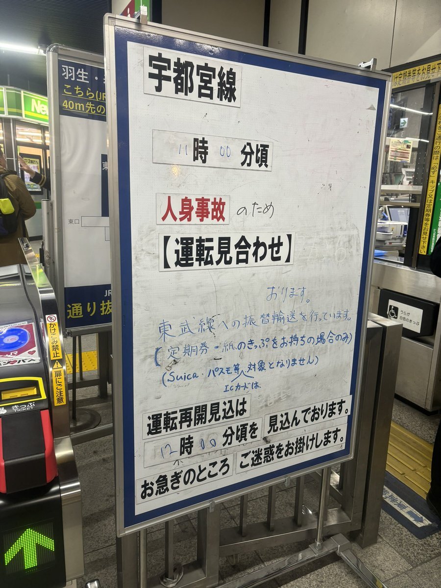 宇都宮線は、土呂駅での人身事故の影響で、東京〜宇都宮駅間の上下線で運転を見合わせています。運転再開は12時00分頃を見込んでいます。 #宇都宮線 #Utsunomiya_Line https://t.co/HbBuJ0JdyU— JR東日本【東北・高崎方面】運行情報 (公式) (@JRE_F_Toho_Taka) January 22, 2025