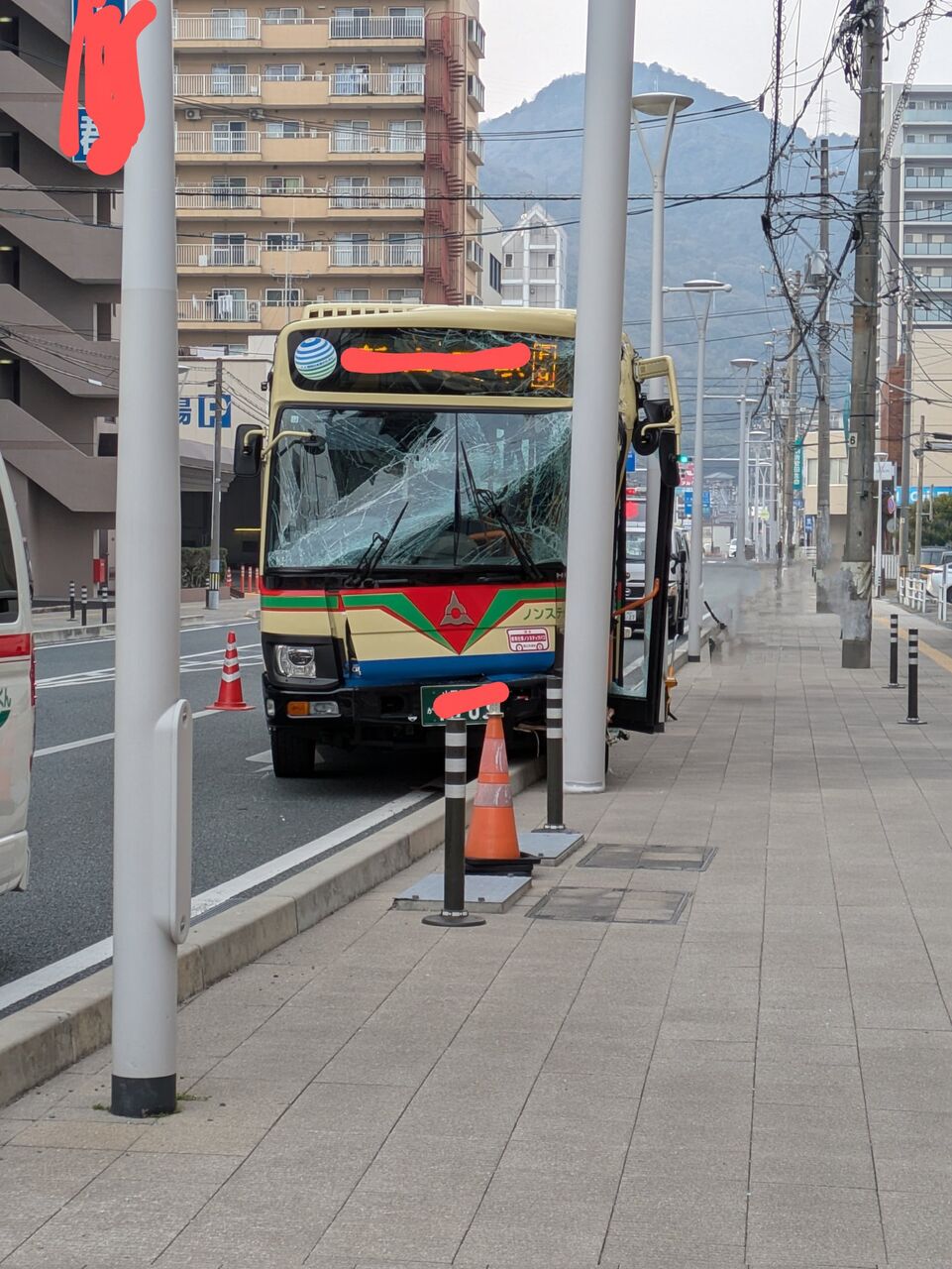 【現場の状況】#交通情報 山口県山口市小郡明治 #山陽本線 新山口駅北側付近 路線バスが電柱に突っ込む事故 バス車両フロント大破1月22日 #山口 #新山口 #バス