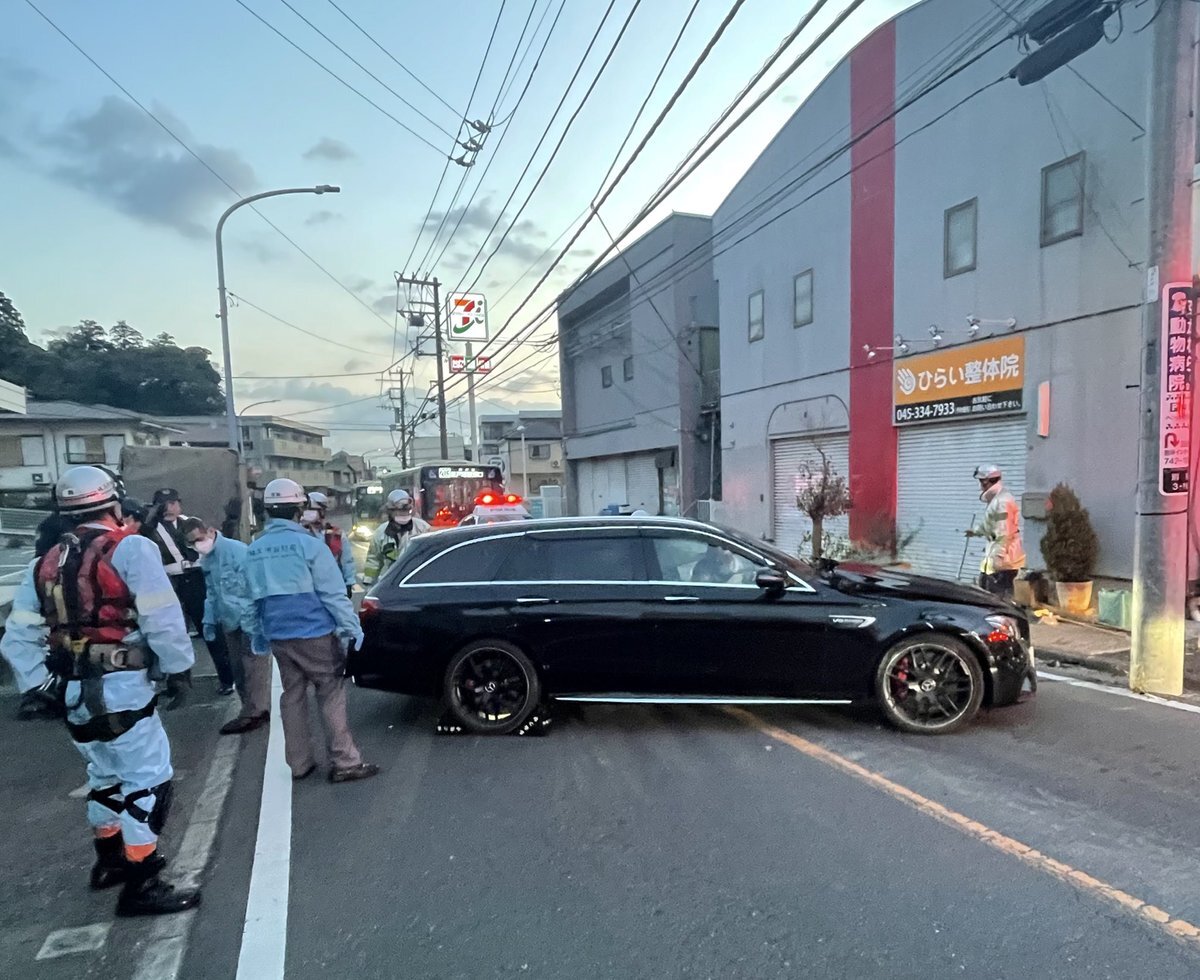 【現場の様子】#交通情報 横浜市南区別所3丁目付近 高齢者運転ベンツ車線塞ぐ事故で一時通行止め渋滞 京急上大岡駅向かう神奈中バスなど遅延混乱1月23日 #横浜 #上大岡 #東戸塚
