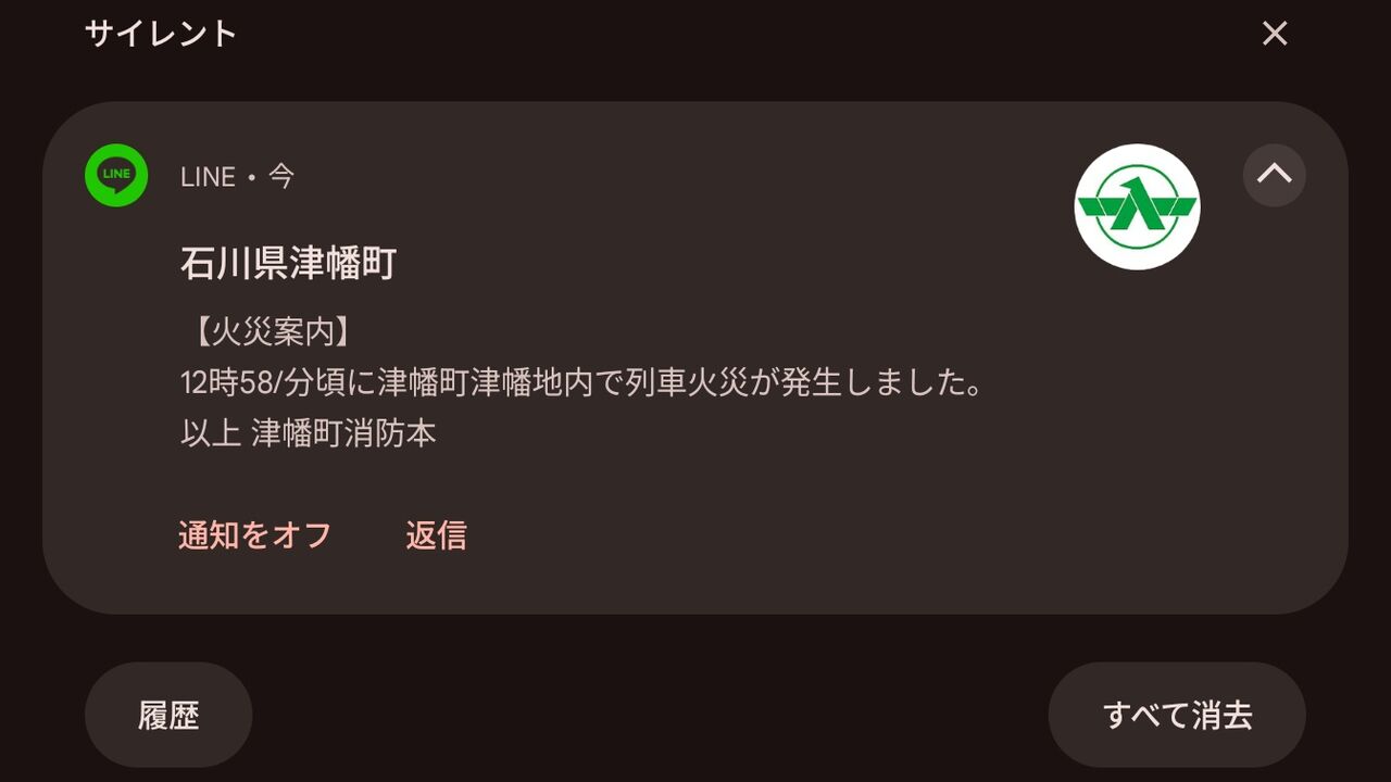 ◆2025/01/25 (土) 12:56 津幡町津幡地内で列車火災が発生しています。