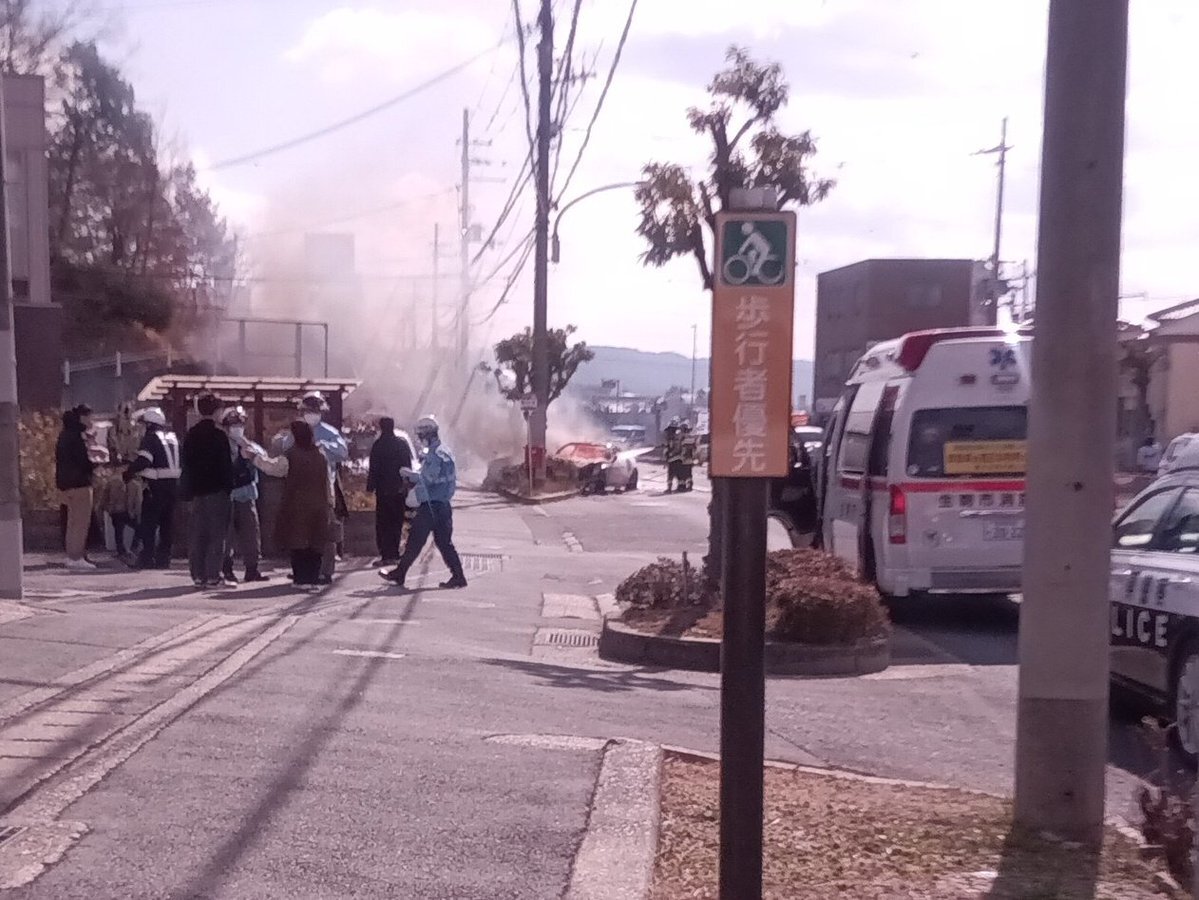 【火事情報】#交通情報 #国道168号 奈良県生駒市小明町 ユニクロ北側付近 自動車燃える車両火災事故で一時交通規制1月25日 #奈良 #生駒 #火災