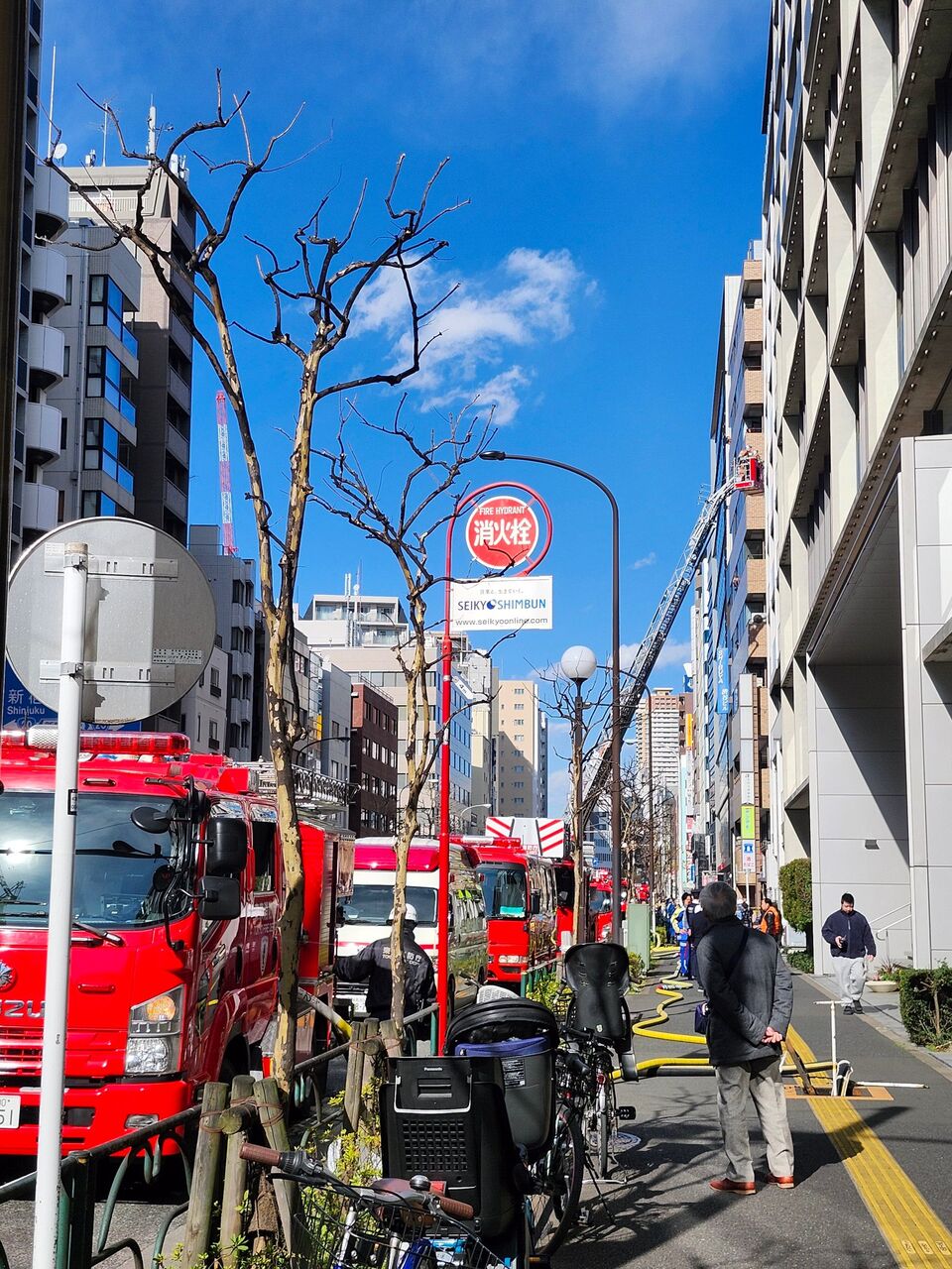 四谷警察署のすぐ側に消防車20台くらい来ててはしご車がはしご伸ばしてたから火事かな💦