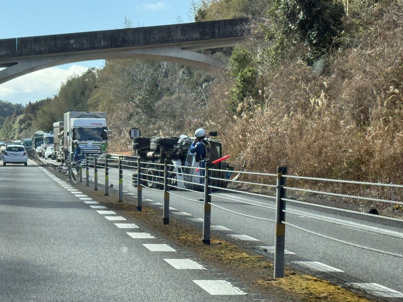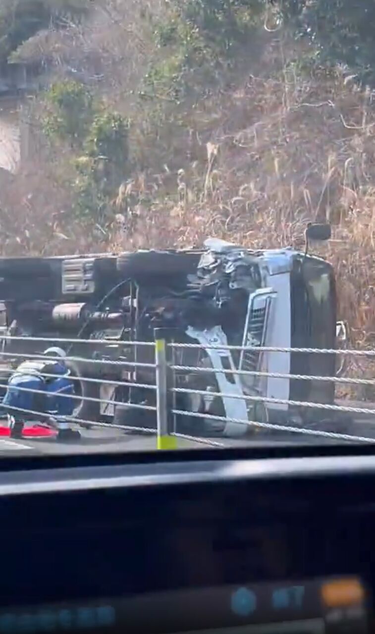 『東九州道上り、宮崎の新富町付近 横転事故です』