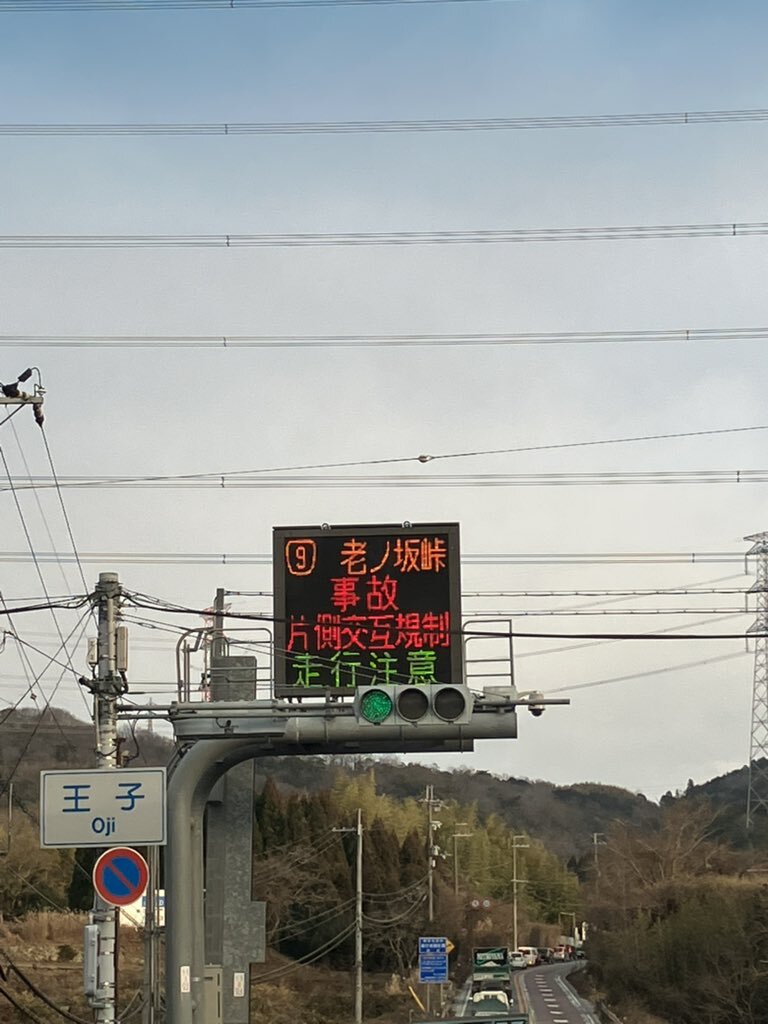 今老ノ坂抜けようとしてる人で、急いでるなら事故渋滞してるから諦めて縦貫乗ろうね