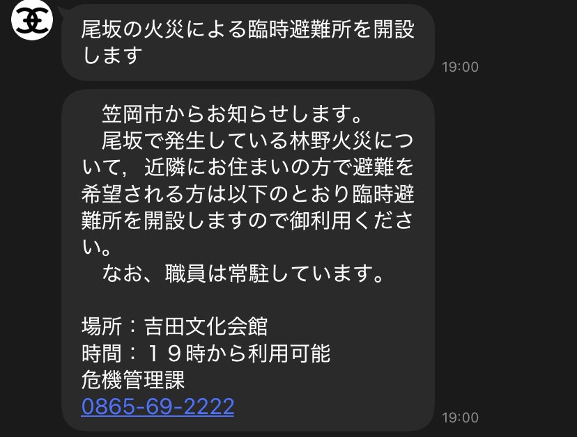 尾坂で発生している林野火災について,近隣にお住まいの方で避難を希望される方は以下のとおり臨時避難所を開設しますので御利用ください。