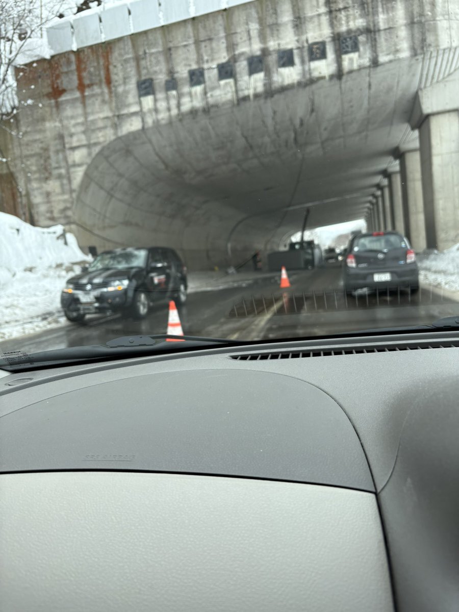 『神居古潭、覆道内でハイエース横転のため大渋滞。