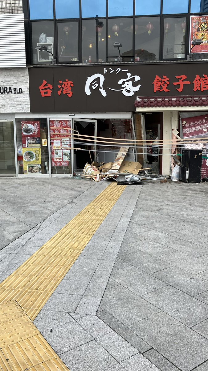 たまたま通りがかった交差点で交通事故の状況。交差点や駅のプラットフォームの前の方では待たない方がいいです。ニュースで聞かないけど歩道のガードレールを突き破って餃子店に車かトラックが突っ込んだみたいですね。玄関破茶滅茶です。この状況では轢かれたら助からなさそうだ。 pic.twitter.com/ua0PIivLkA