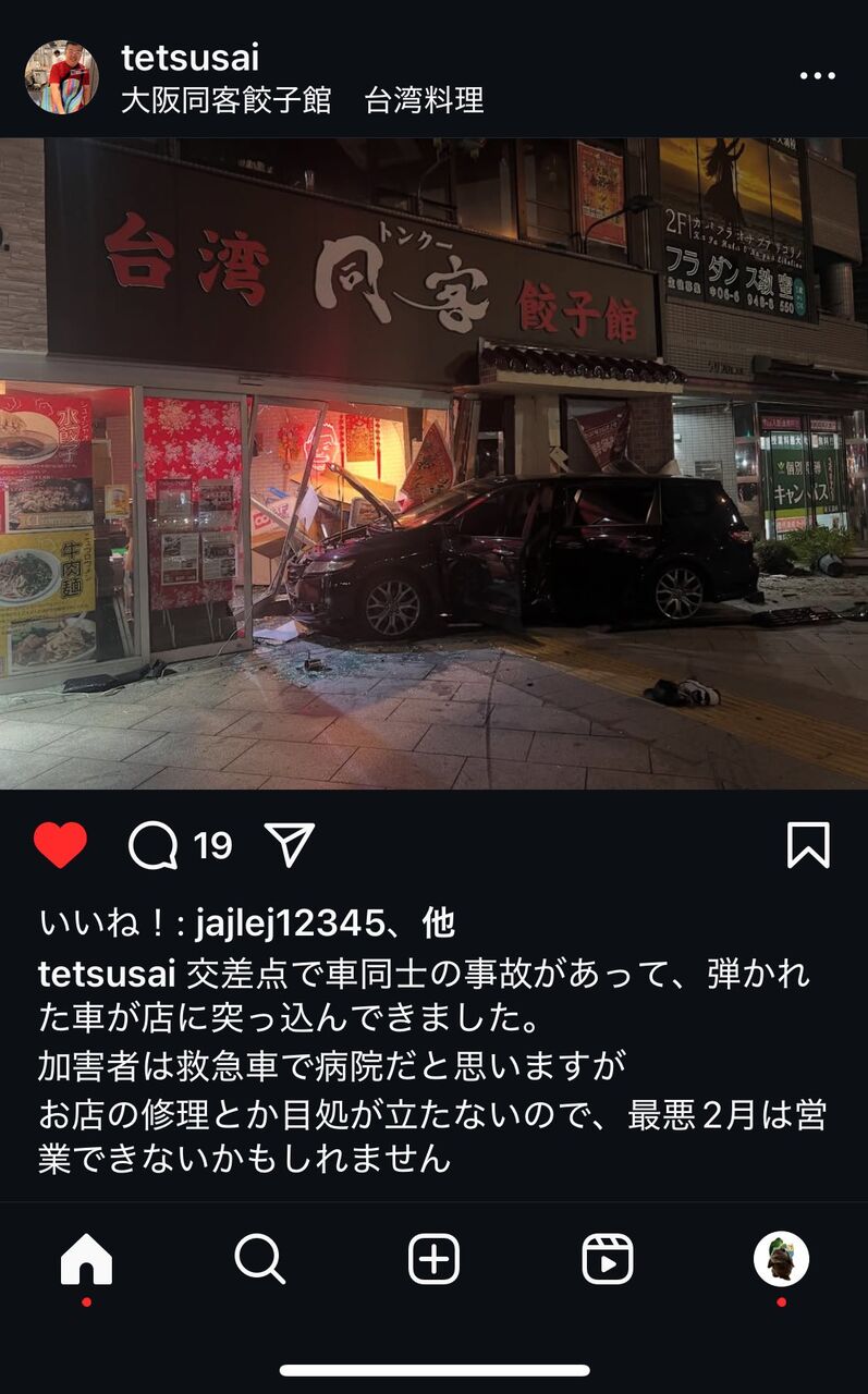 『友だちの経営する台湾同客餃子館に車が突っ込んでえらいことに…』