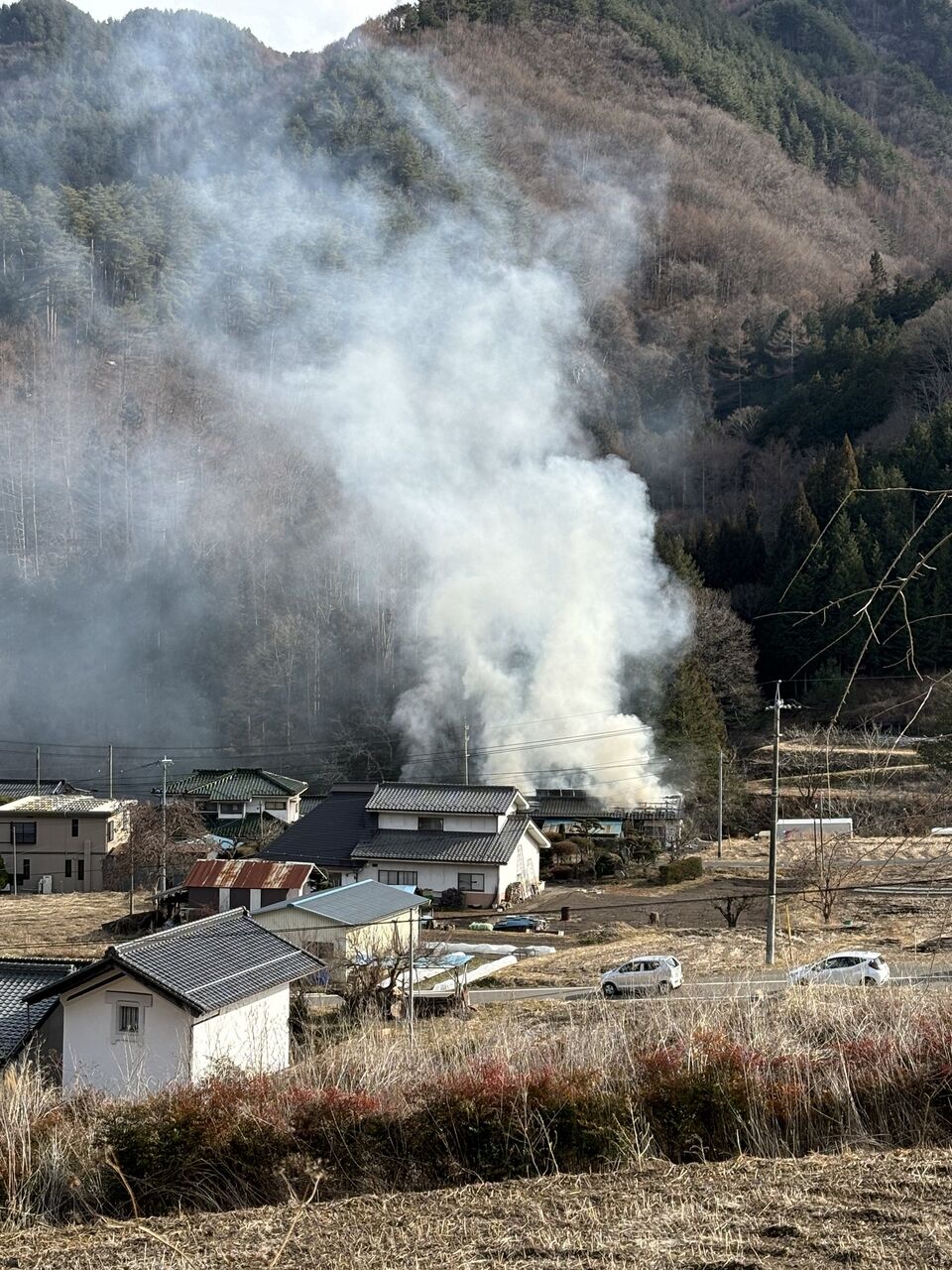 三才山の道で火事
