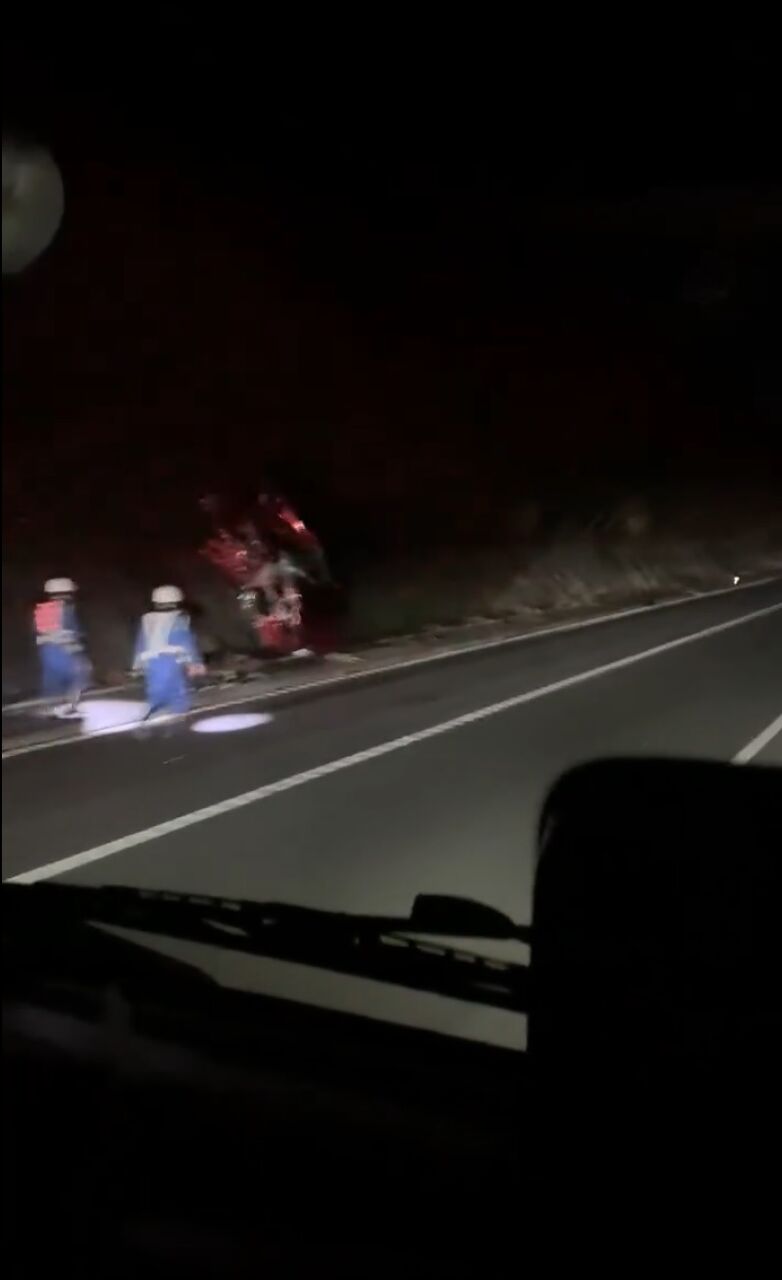 反対車線でしっかり見えなかったけど多分大型と普通車。普通車は路肩超えて斜面に逆立ち大破(?)』