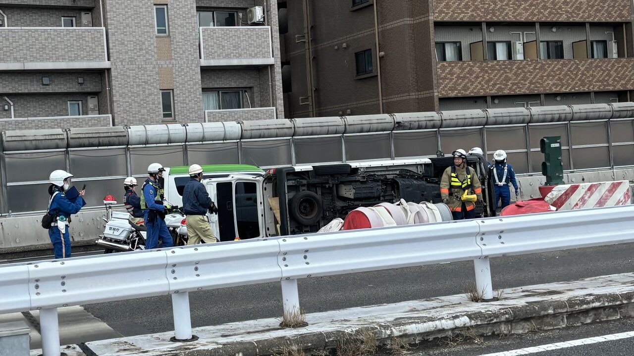『首都高上り初台あたりでワゴン車横転してた。カーブではないし、パンクか?』