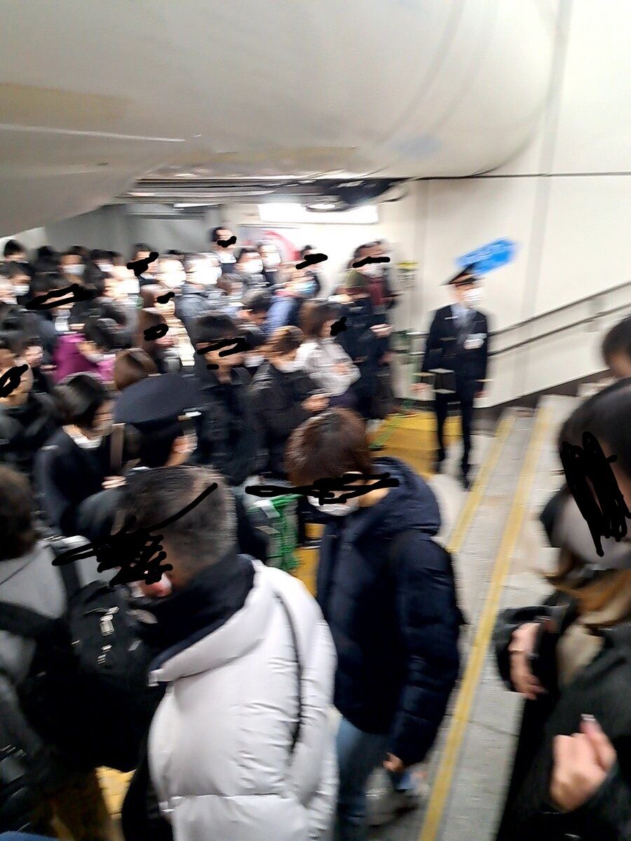 『新宿駅湘南新宿ラインのホーム人があふれてる。階段下で規制されていてホームに上がることすら出来ない状態』
