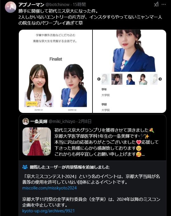 【公開処刑】ミス京大で謎のミャンマー人を倒した女さん、正体がヤバすぎて炎上wwww 2025/2/13 速報 勝手に開催して初代ミス京大になった件。 2人しかいないエントリーの片方が、インスタすらやってないミャンマー人の院生なのパワープレイ過ぎて草 — (@botchinow) なるほどね タレントになりたい活動してた子のプロモーションだったわけか 優勝者 ↓ 正体 — (@JapanTank) ん? document.write(” + ”); 関連記事 document.write(” + ”); 続きを読む ——— Source: アルファルファモザイク 【公開処刑】ミス京大で謎のミャンマー人を倒した女さん、正体がヤバすぎて炎上wwww