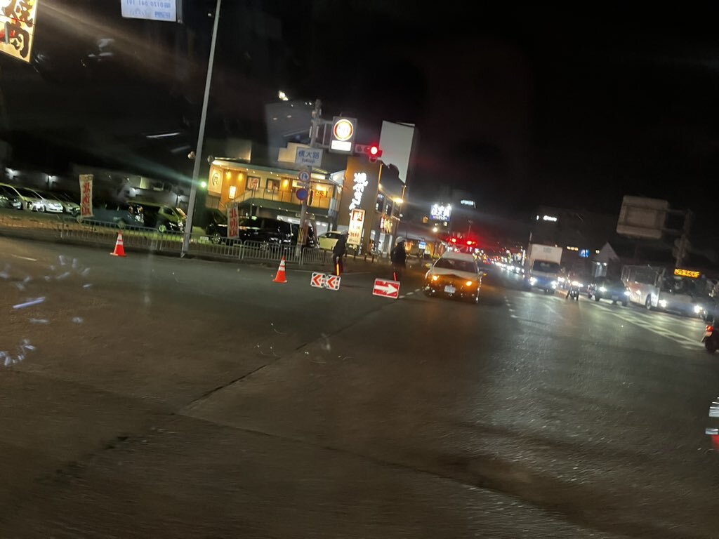 『1号線上り横大路から事故で通行止め。バックスのあたりで車と車がぶつかって二車線塞いでた』