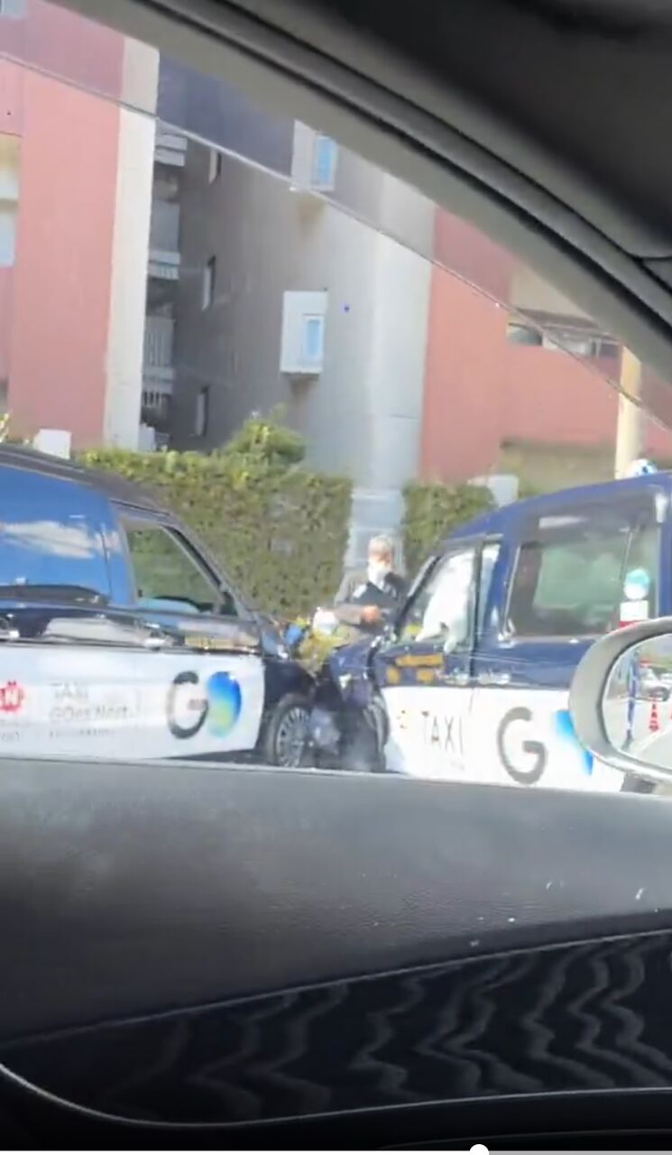 事故を目撃したわけではありませんが、状況から推測するに、右側にタクシー会社があり、タクシーが帰庫しようとした際に、直進車と衝突したように見えます。