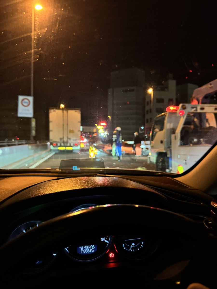 【現場の状況】#交通情報 #首都高 C1 都心環状線 外回り 霞が関付近 タクシーと衝突破片散乱トヨタ86(ZN6)の横転事故で規制渋滞2月21日 #渋滞 #霞が関