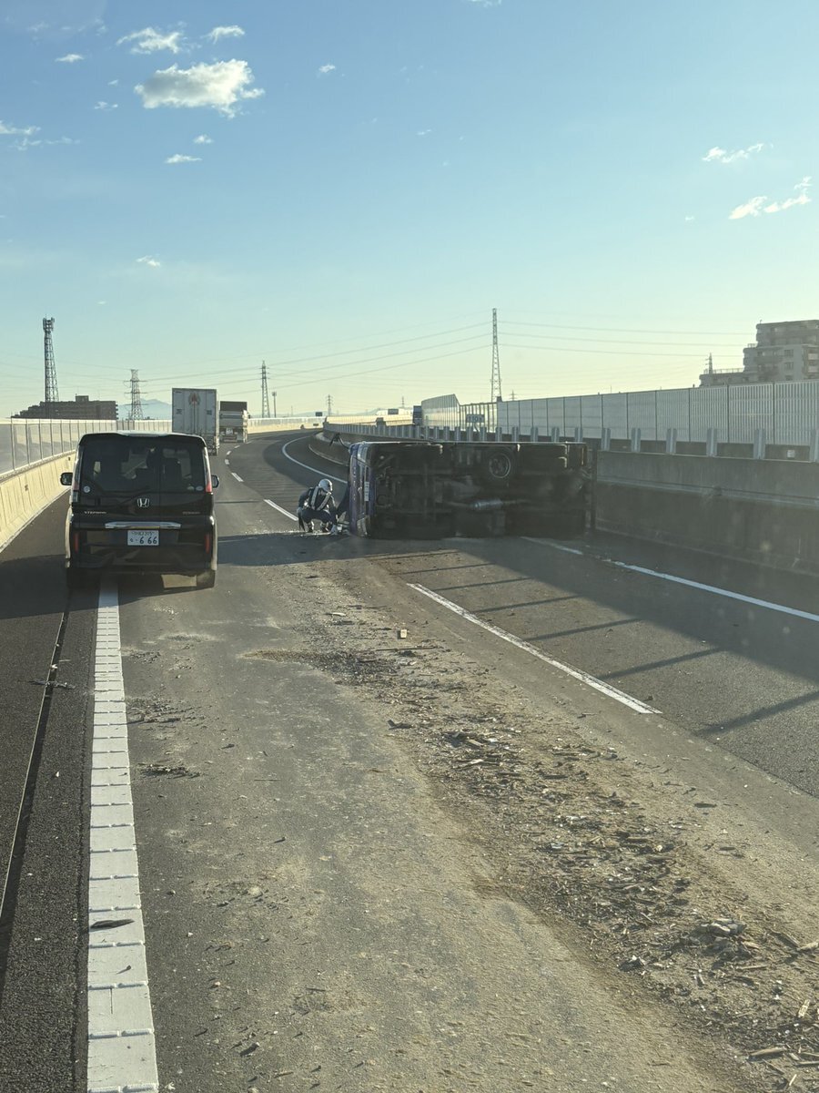 『あらーーーー横転してるし道路にぶちまけてるしやばー』